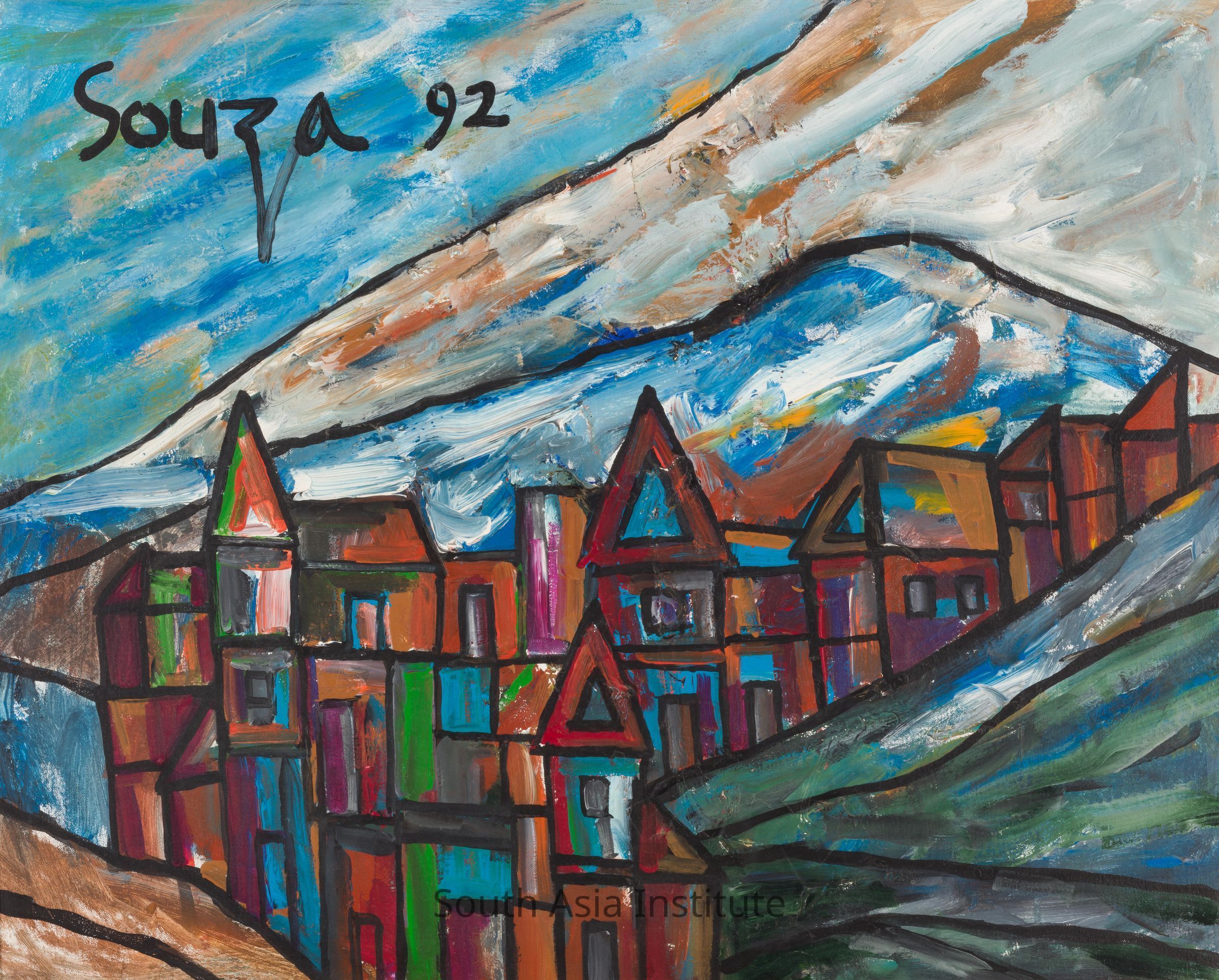 Souza’s cityscape looks more like an imagined mountain hamlet than the busy populated New York neighborhood where he lived in the 1990s.