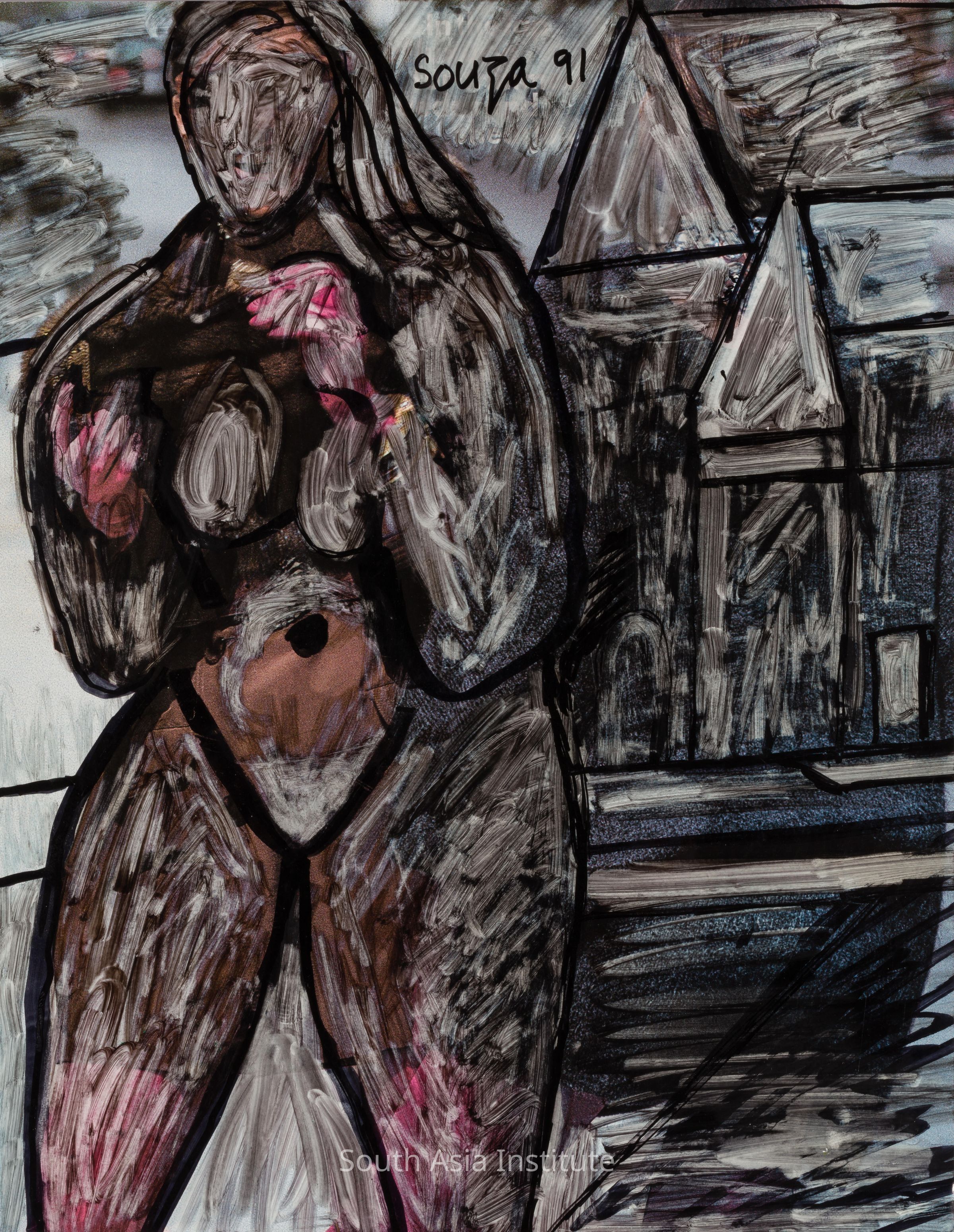 Souza’s fixation with female nudes and city architecture come together in this painting. The heavy black outline gives a raw, emotional stance to this work. Triangular grey colored rooftops suggest male phalluses like the one between her legs. Is this a male fantasy or a haunted woman’s nightmare?