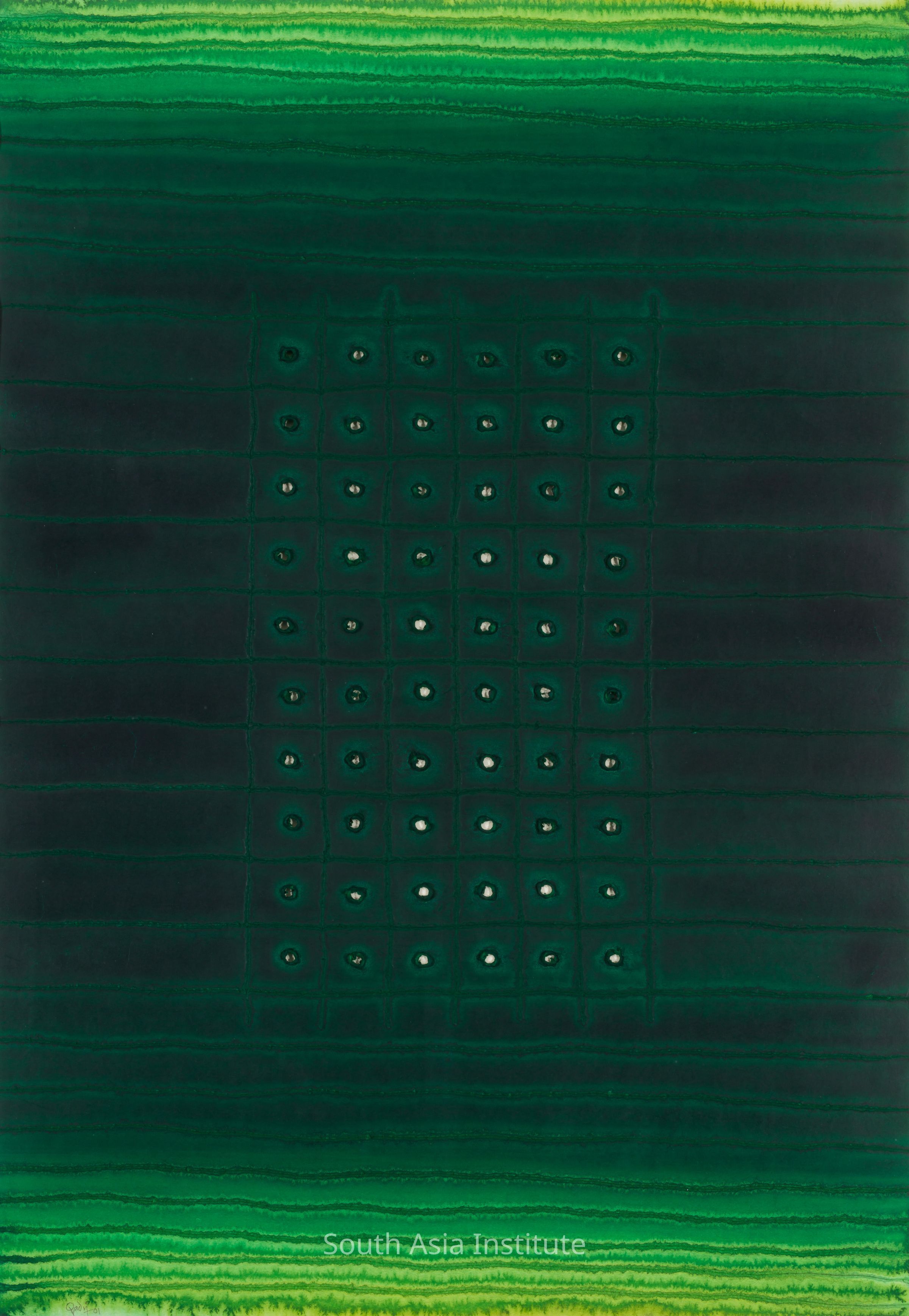 Qadri’s punctured dyed paper works are a reflection of his childhood connection with a Tantric yogi and a Sufi adept. The minimalist composition corresponds to states of deep meditation and the luminous colors found in market stalls and temples throughout India. Born in an Indian village in the Punjab, he settled in Copenhagen in 1971.