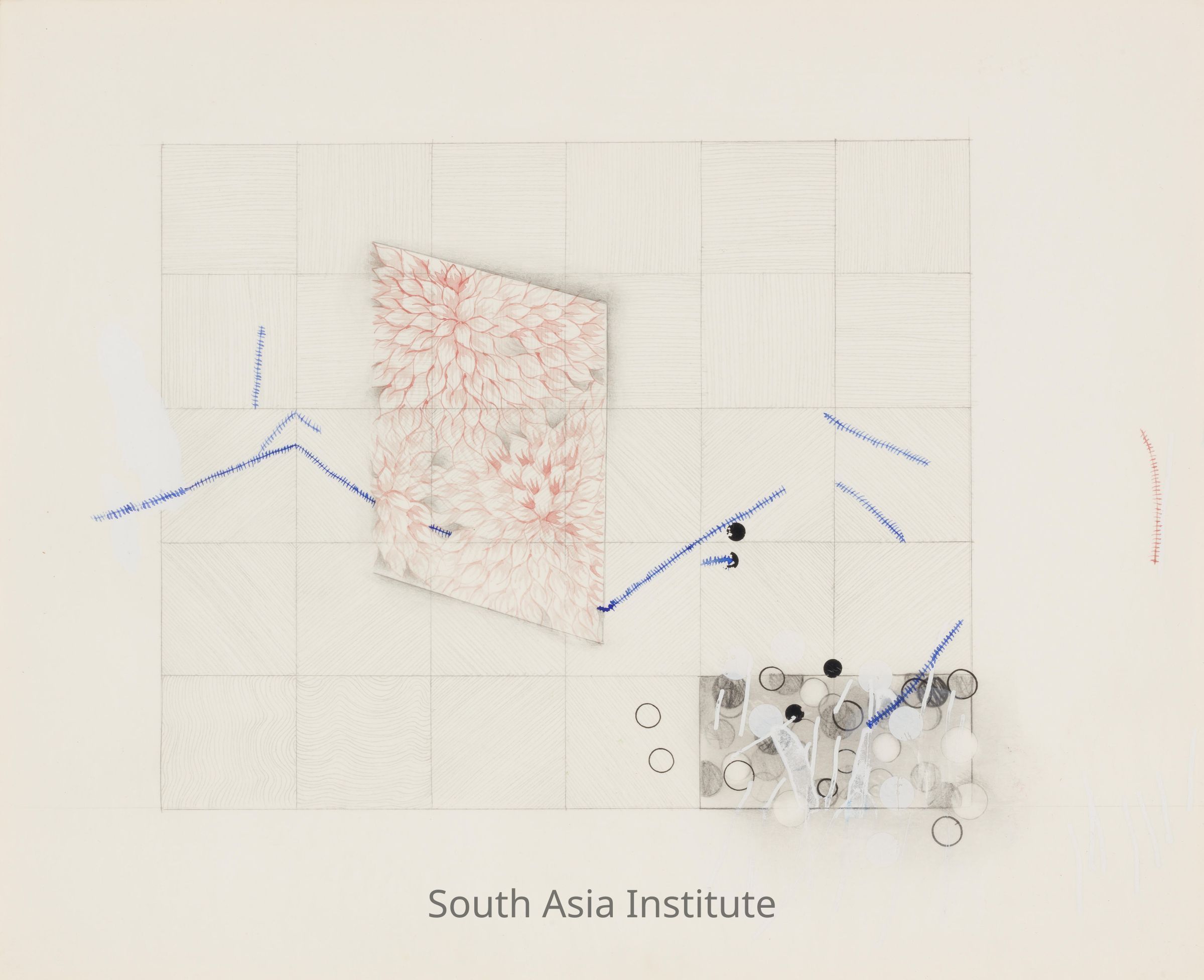 In the first stage of painting a traditional miniature, a grid is impressed onto the paper for measurement and proportioning the image. Qureshi has incorporated the grid into his painting. His earlier flowers and leaves were blue and it reappeared this year, in his latest installation at a girl’s school in Pakistan, signifying hope - for better life through education of women.