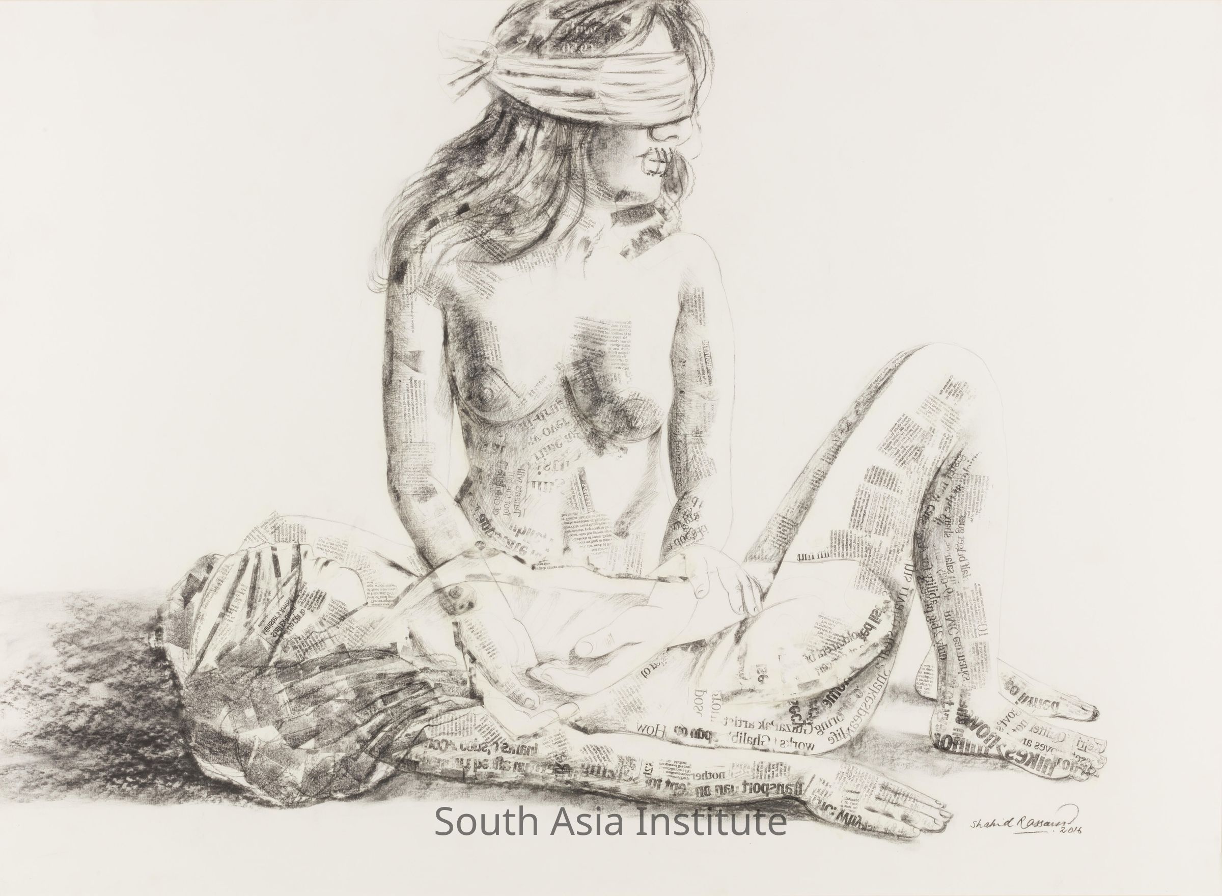 Rassam’s work is a blend of words and images based on current narratives. In this work that is a plea to curb worldwide terrorism, he combines the image of newspapers and the figure of a woman and a child, the usual victims of the acts of extremism. Inspite of extensive press coverage, leaders seem to be indifferent to the suffering being inflicted.
