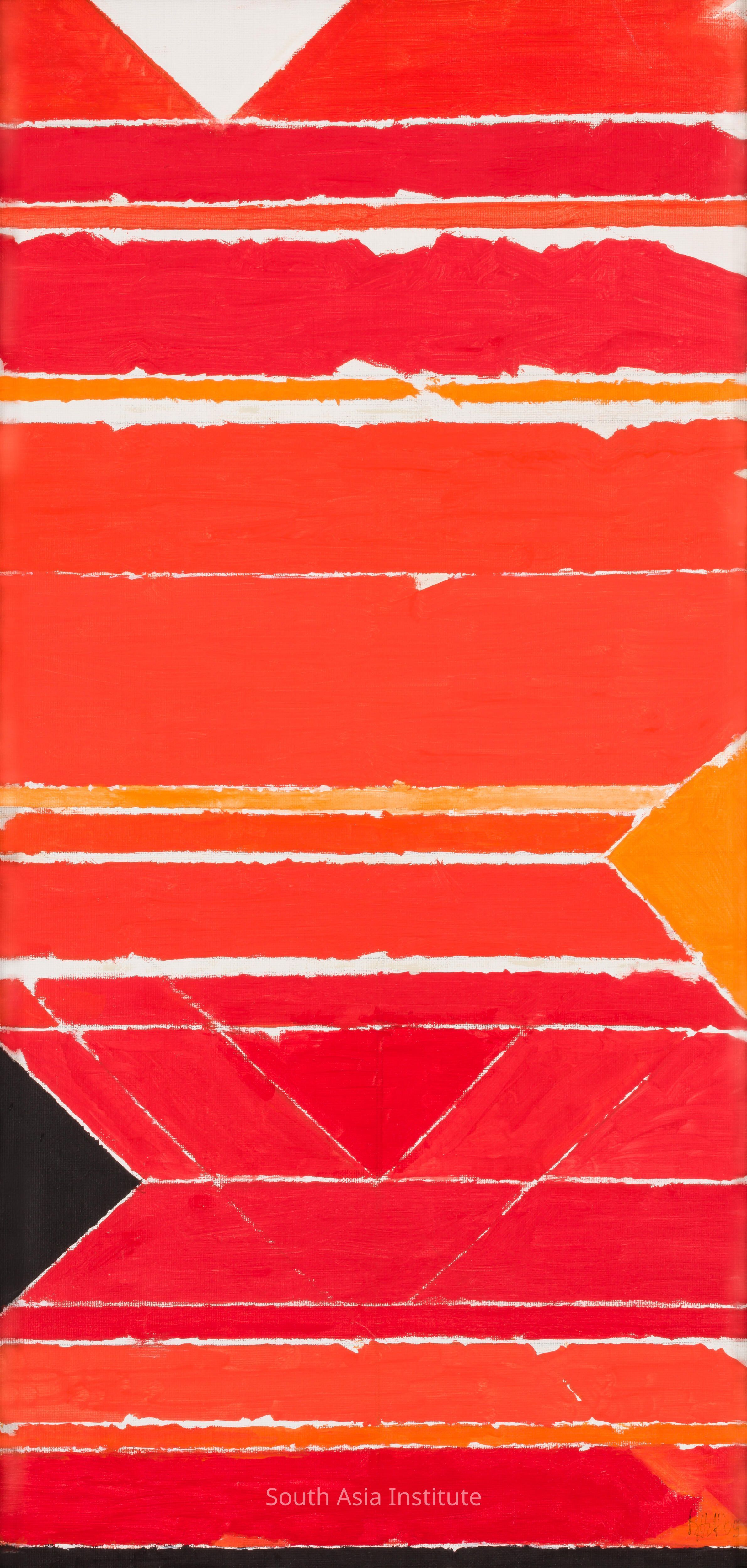 Raza’s Triangles combines the patterned delineation of American East Coast Color Field painters like Kenneth Nolan and Morris Lewis with the sensibility of Tantric yantra painting.