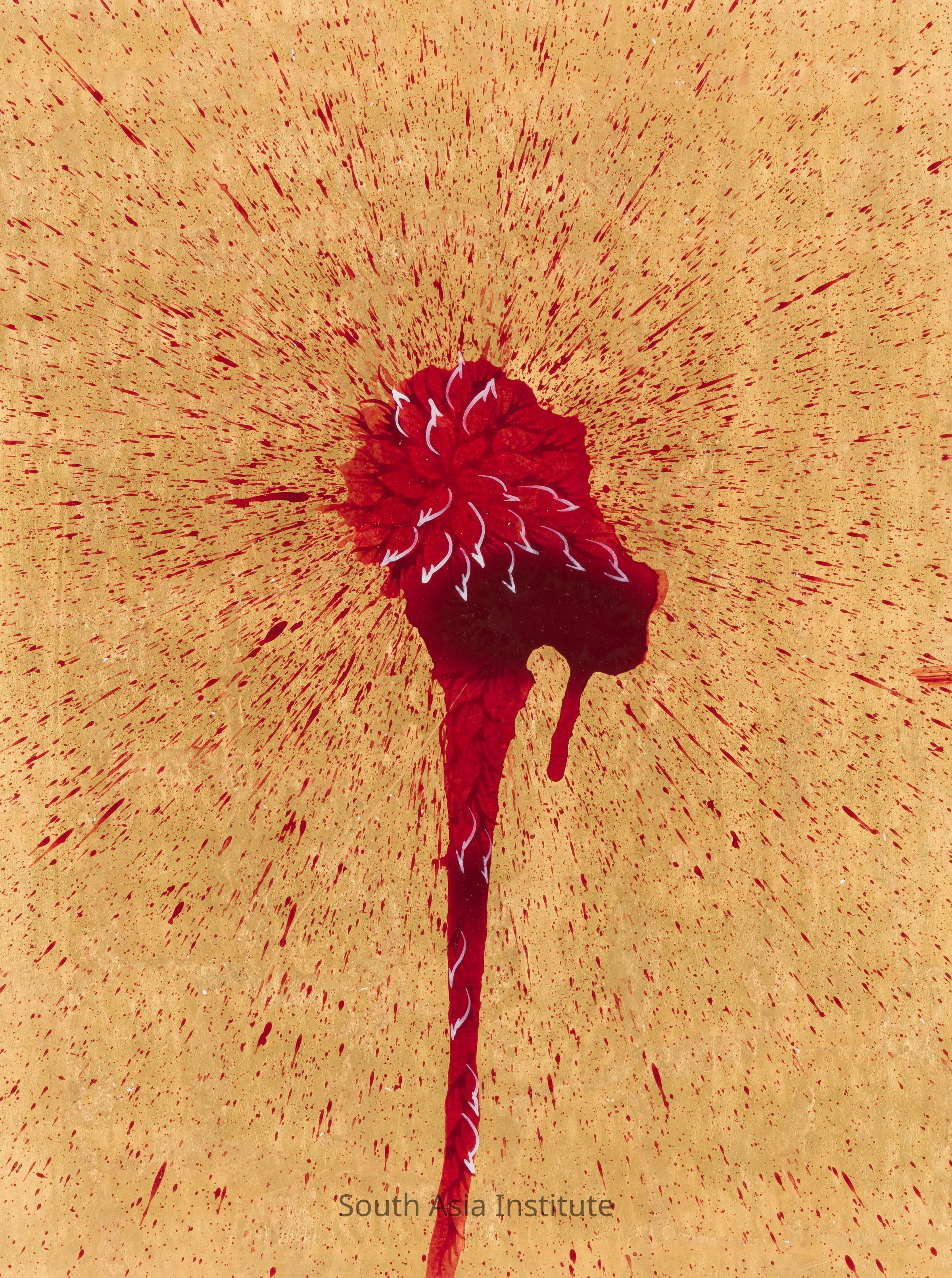 Signature blood splatters transform into the stem and head of a flower in bloom: a reference to Qureshi’s hope that beauty can evolve from bloodshed.