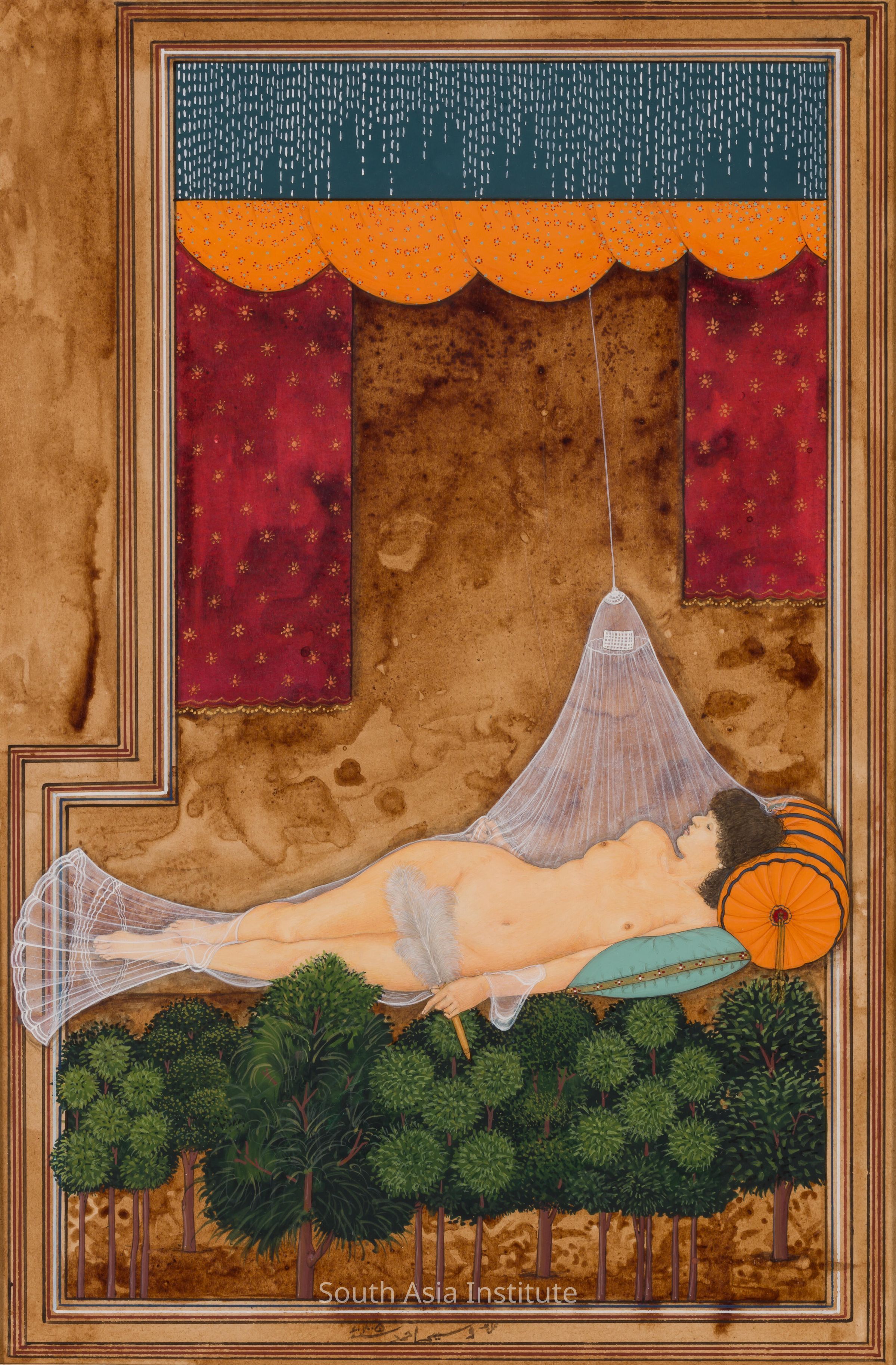 Ahmad’s version of Manet’s Olympia, the voluptuous goddess has abandoned her feather bed for the south Asian bolster, a remnant of historical court paintings.