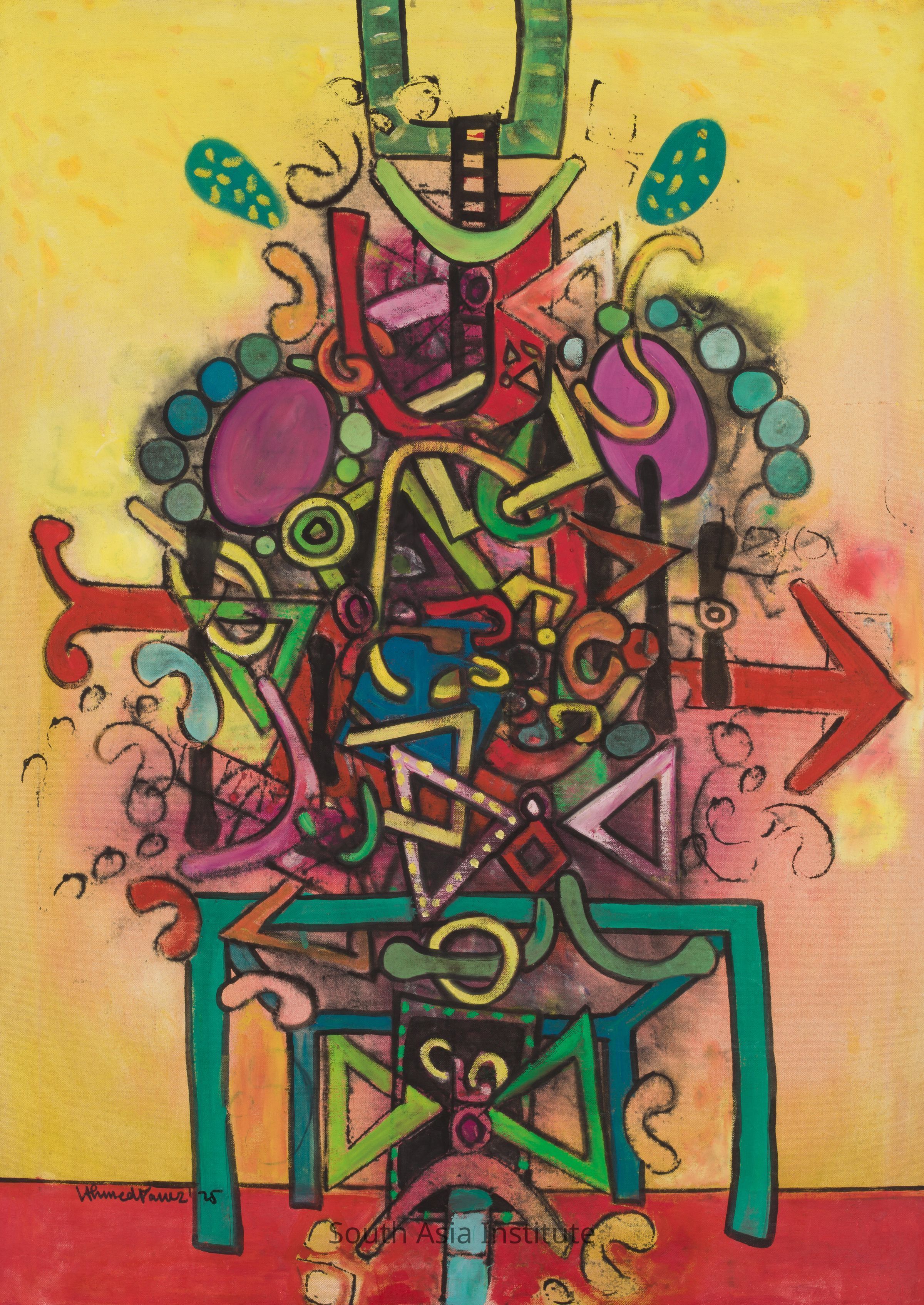 A restless soul, Parvez left for London early in his career where he came under the influence of British artist Alan Davie. His signature style featured an explosion of geometric shapes and curious objects issuing from a jug, or cup or vase or as suggested in this work, a green table. Finely crafted and compositionally refined, Parvez’s surface treatment begs close scrutiny.