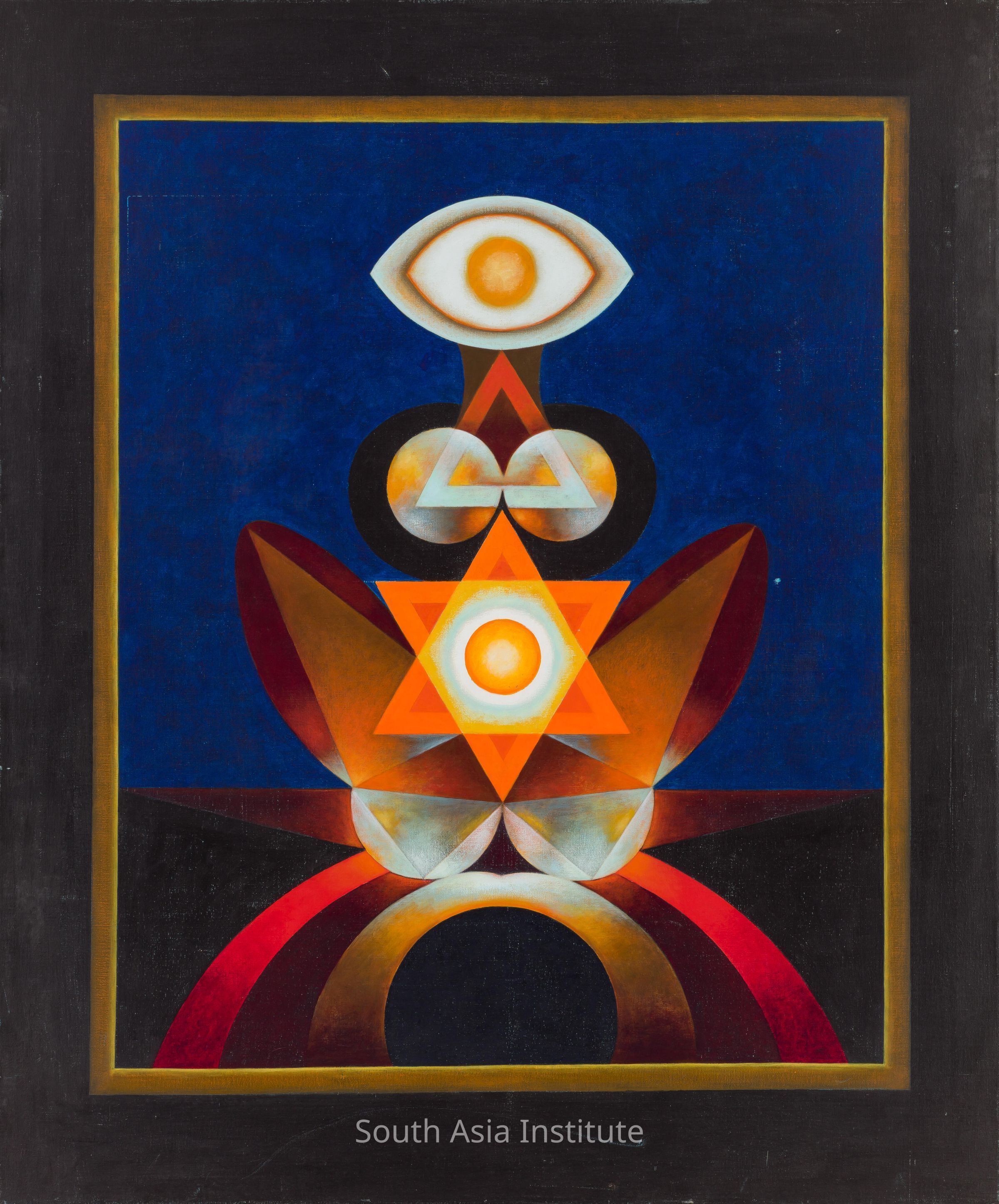 Like many of his Tantric inspired compositions, this painting features the yab/yum motif of Tantric adepts. Two round disks within the upward facing triangle are female indicators. Wing-like shapes flanking the central star represent the bent-up legs of the yab/yum couple. The deep blue background represented the sky in numerous Tantric mandalas.