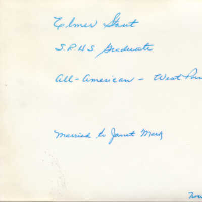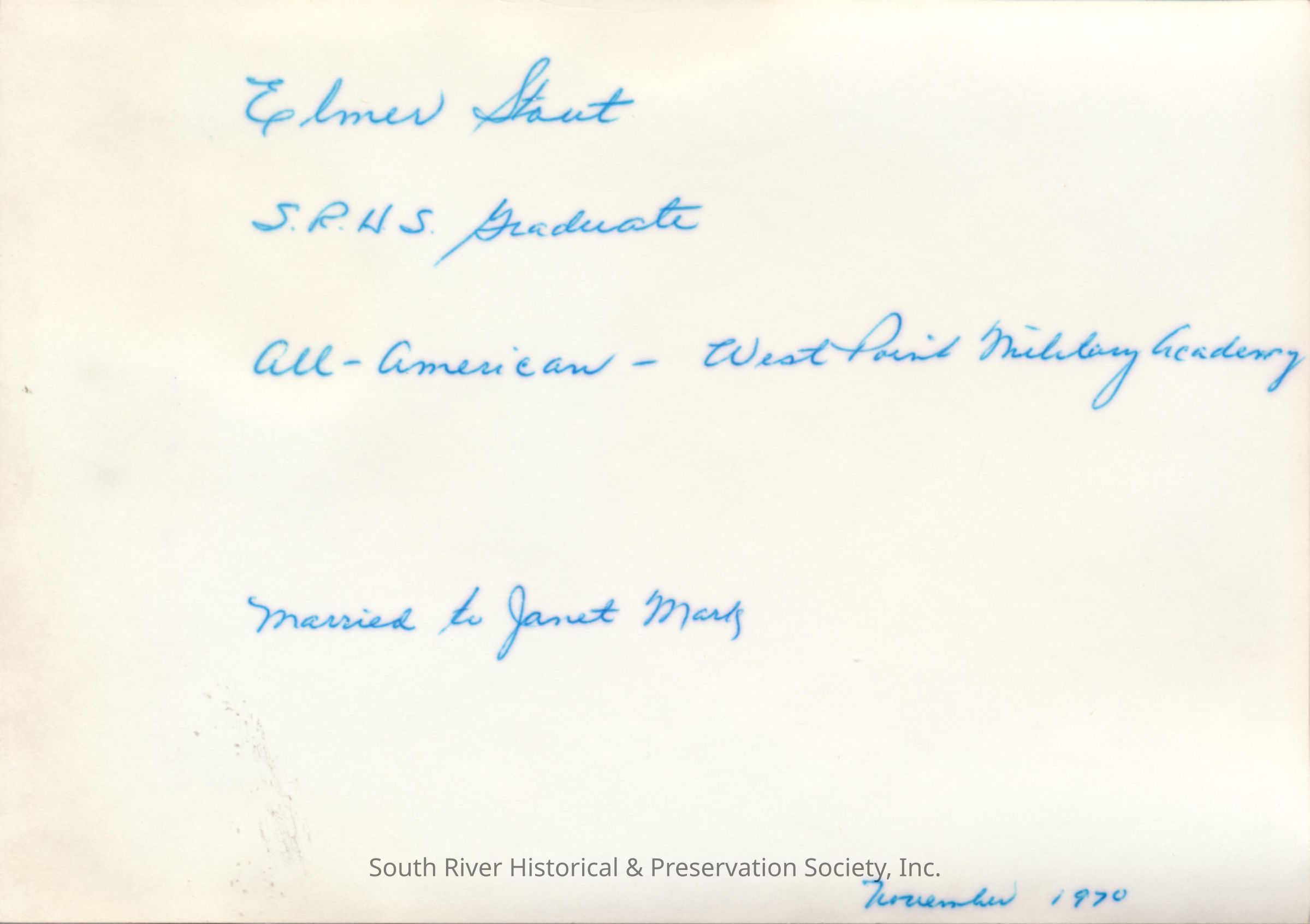 A note handwritten on the back in blue ink reads "Elmer Stout, S.R.H.S. Graduate; All-American - West Point Military Academy; Married to Janet Mark; November 1970."