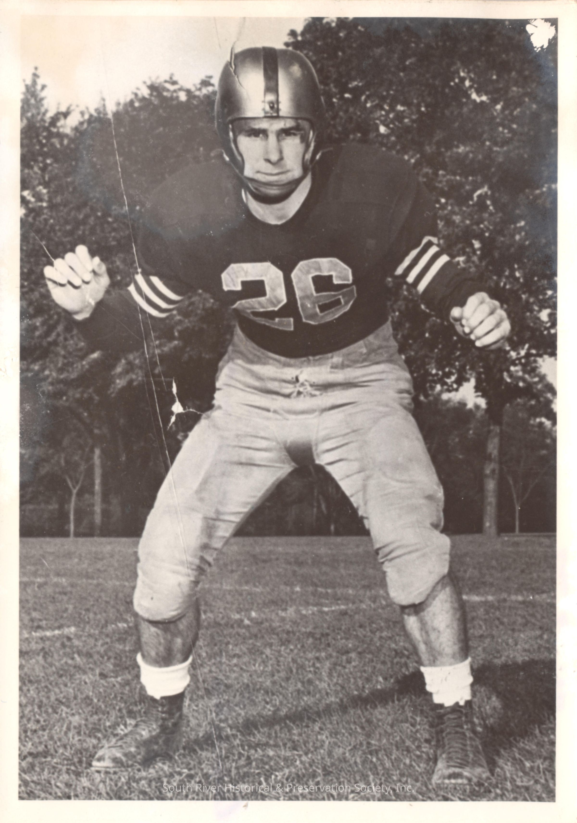 Photograph of Elmer Stout posed in his football uniform, number 26.