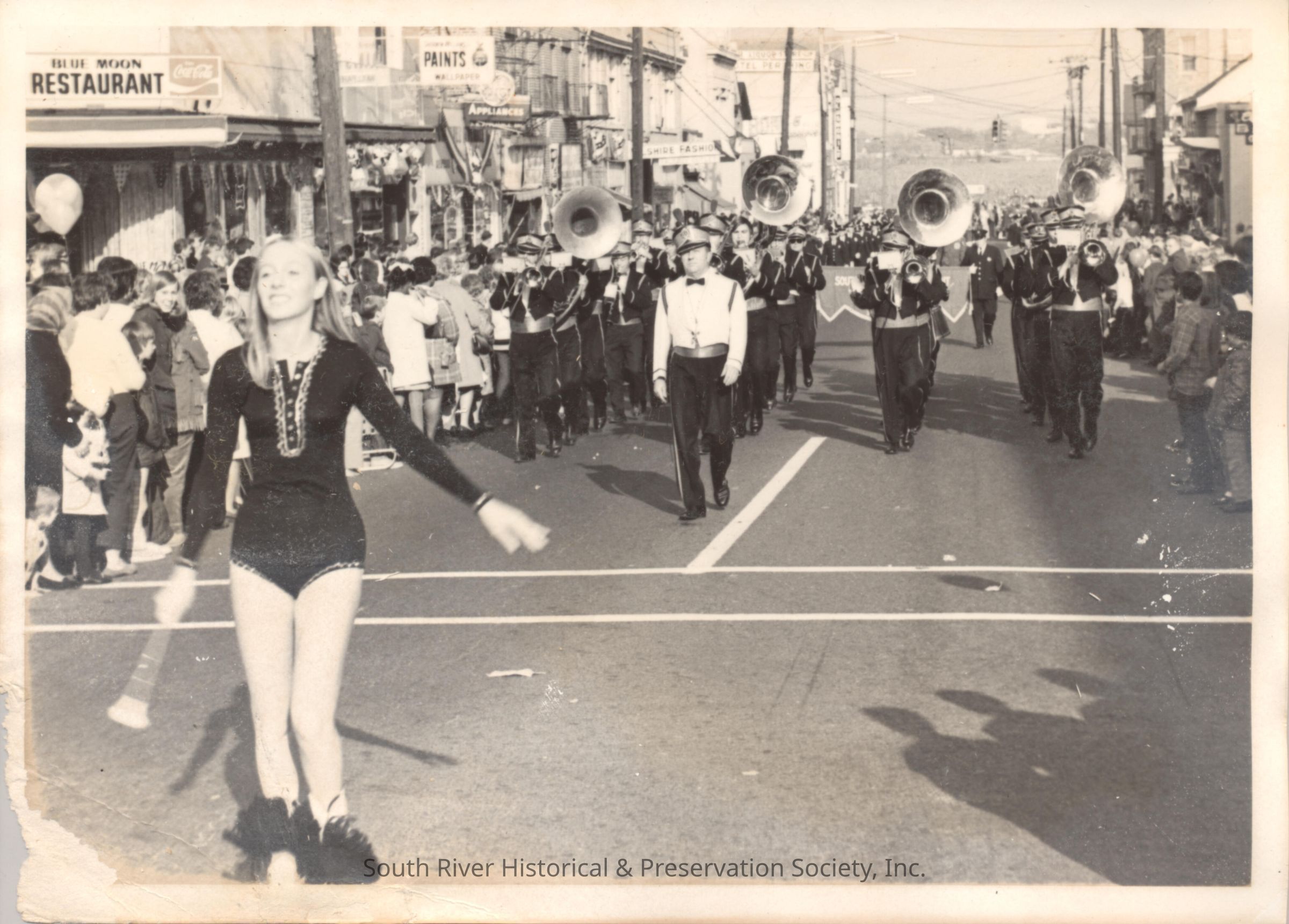 Photograph of the Imperial Band preceded by a baton twirler in the parade held for the celebration of South River's 250th anniversary in 1970. The man in the white jacket leading the band is Theofil "Ted" Kadela. The South River Fire Department is visible behind the band.