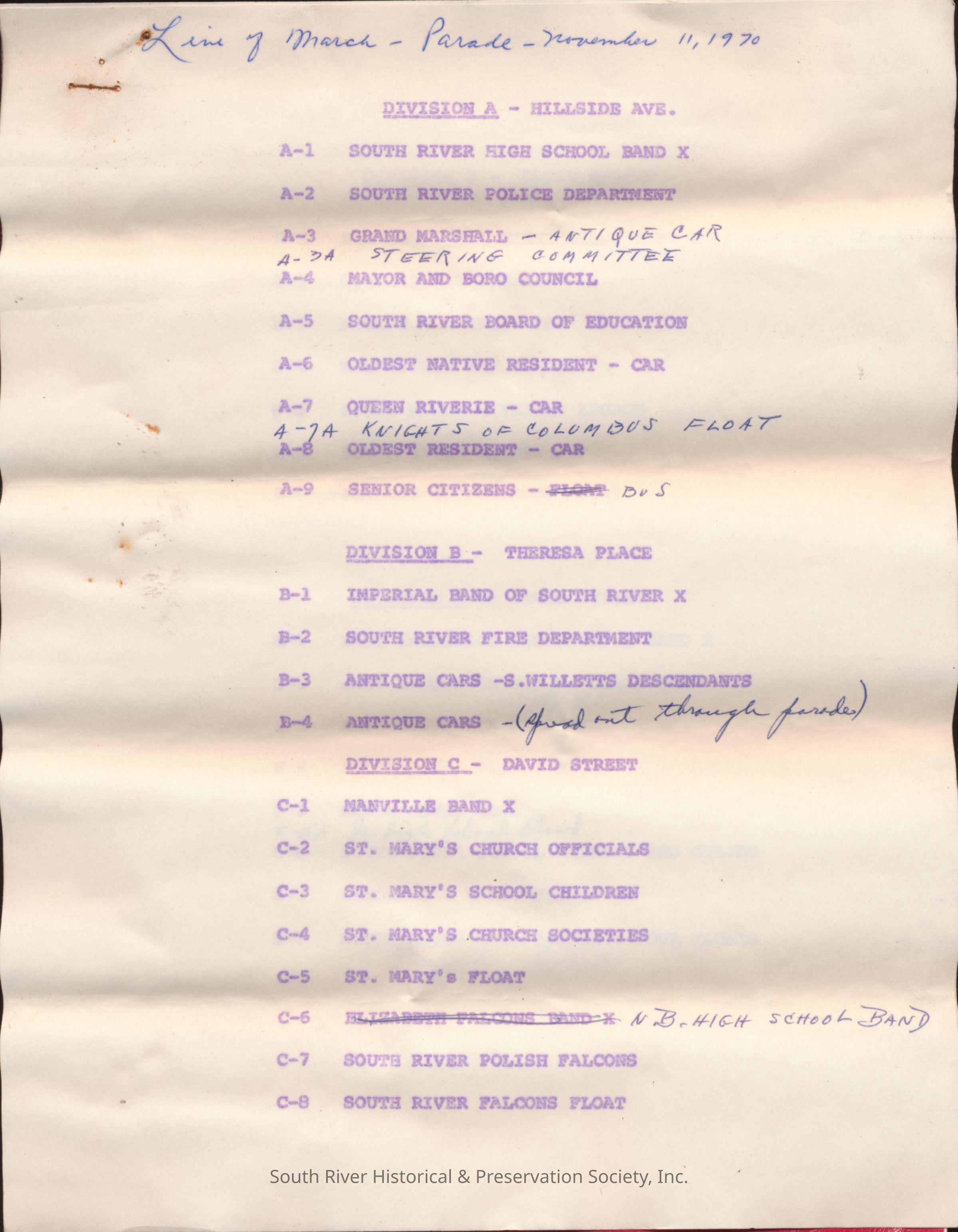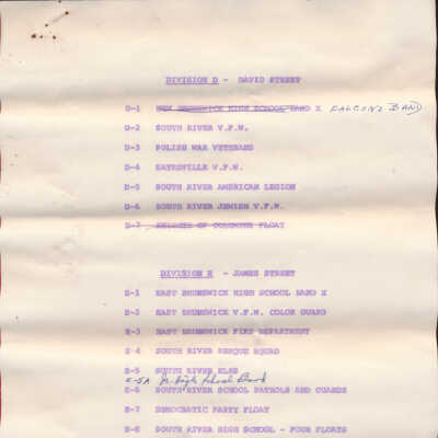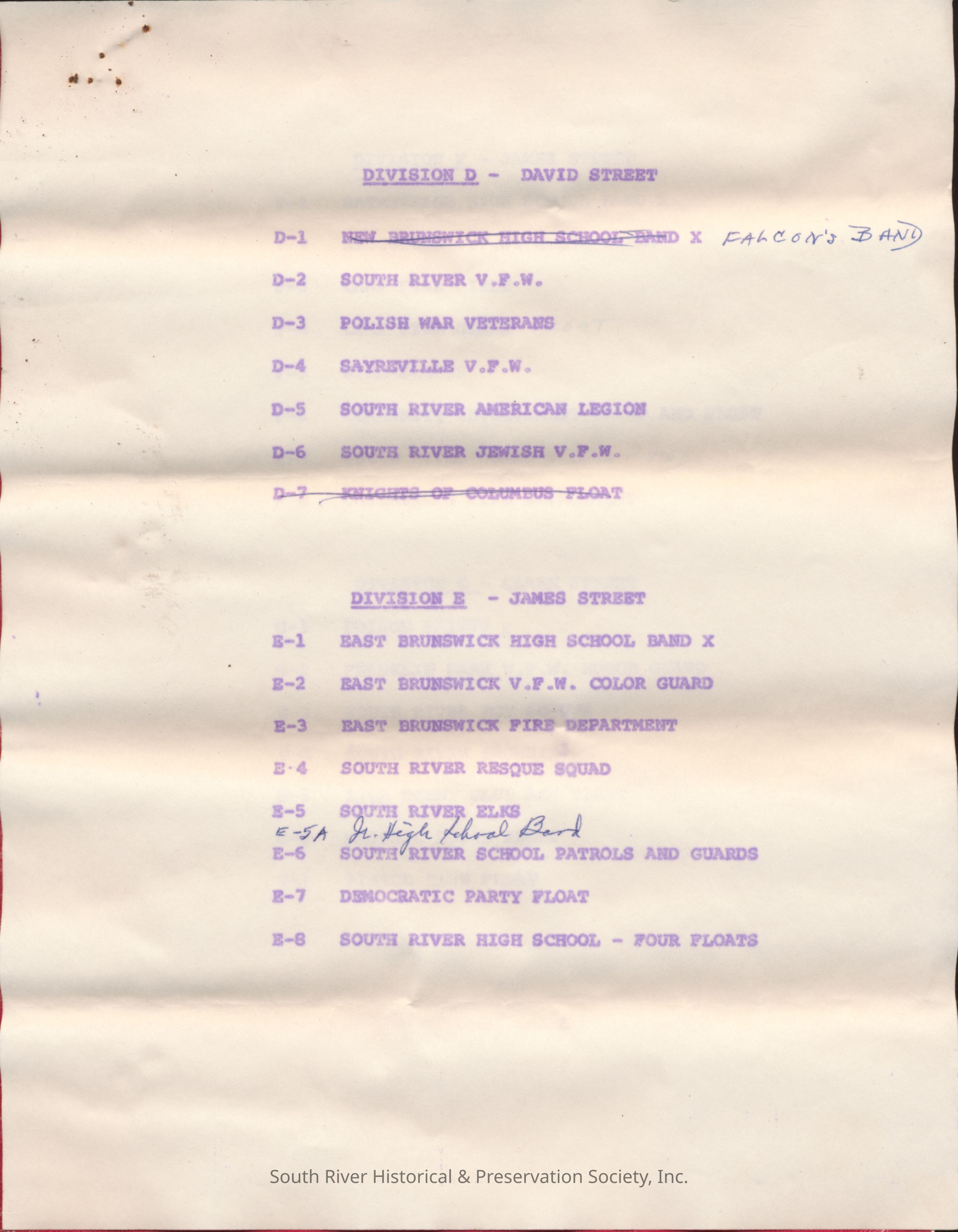 Division D, beginning on David Street, included groups D-1 through D-7. A hand printed note in blue ink added the "Falcon's Band" to replace the " "New Brunswick High School Band X." The "Knights of Columbus Float" was crossed out.