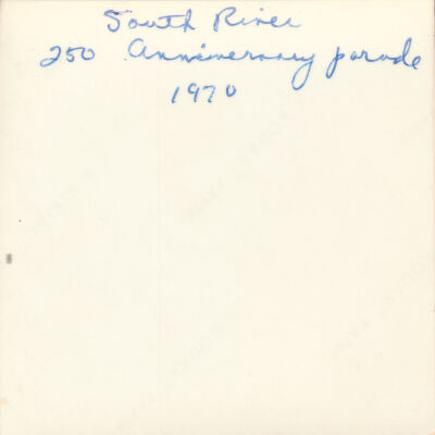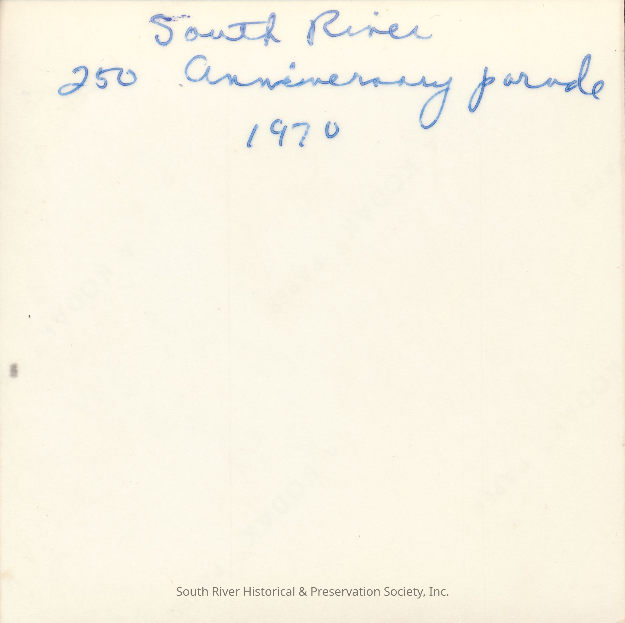 The back of the photo has a note handwritten in blue ink that reads, "South River, 250 Anniversary Parade, 1970."