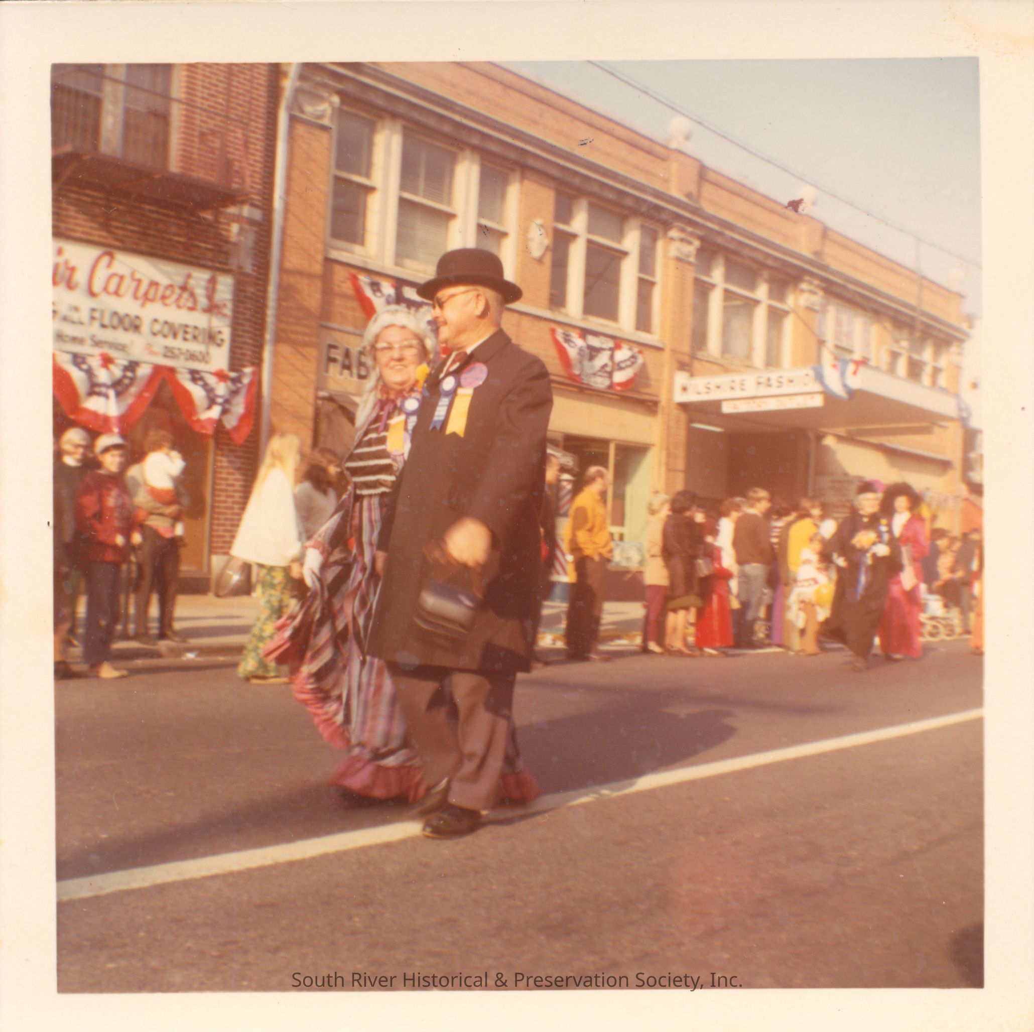 Photograph thought to show members of the Senior Citizens group in costume during the parade held for the celebration of South River's 250th anniversary in 1970. The man and woman in the forefront appear to be wearing Steering Committee ribbons.
