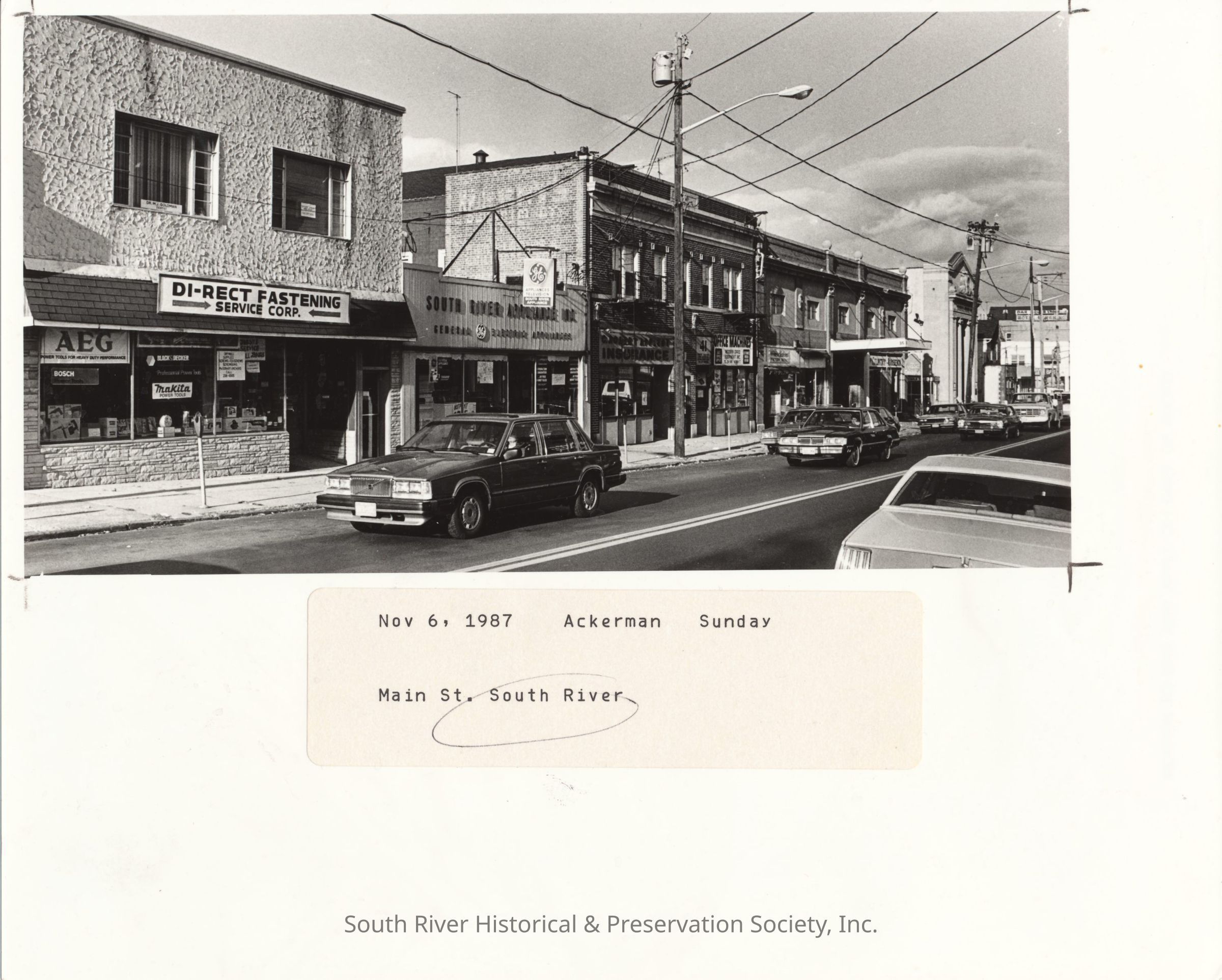 A label has been affixed below the image. It reads, "Nov 6, 1987, Ackerman Sunday, Main St., South River."