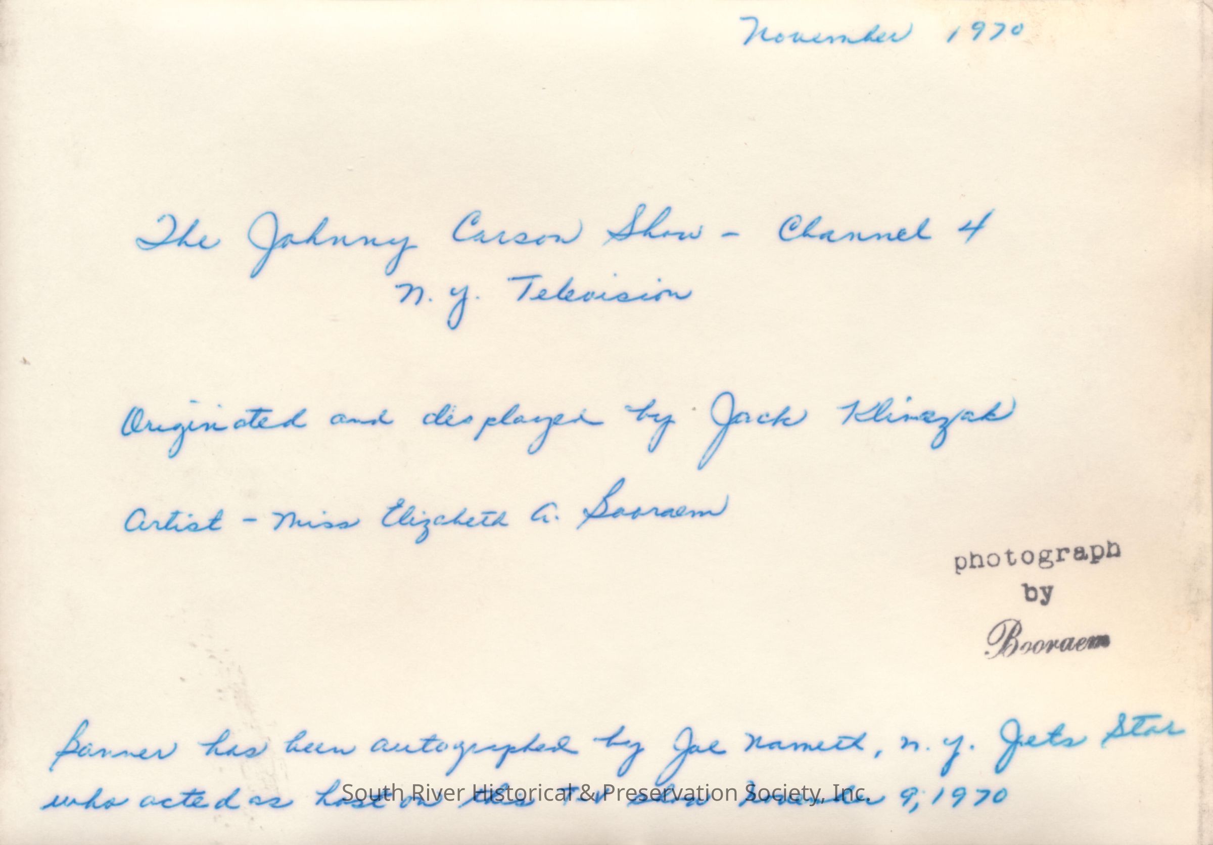An October 14, 1970 issue of the Sentinel newspaper included an article about the banner. "SR Birthday Card on Nationwide TV." The beginning of the article reads "Jack Klimcsak of Woodbridge has gotten so swept up in the spirit of South River's 250th anniversary celebration that he plans to spread the word to the nation." "Klimcsak, who was born and raised in the borough, plant to display a seven-foot long birthday greeting on the Dick Cavett Show and Johnnie Carson's Tonight Show. Klimcsak's sign reads "Congratulations South River, N.J., 250th Anniversary, November 7-12." He has tickets for the Cavett show on October 23 and the Carson show on November 3. The sign can be held by two persons, and Klimcsak hopes to show it on the screen ling enough to let viewers get the message." There are three additional paragraphs in the article.