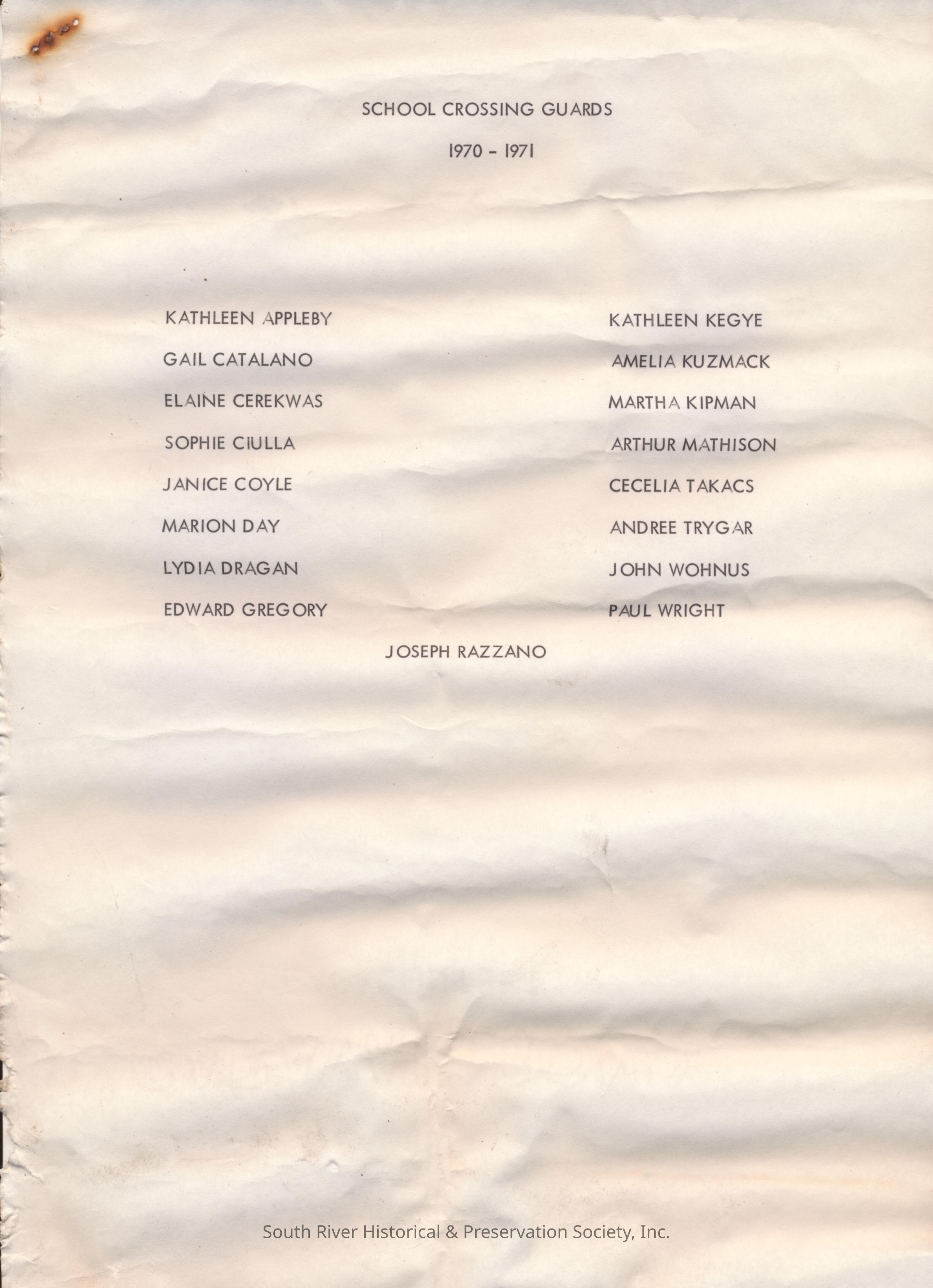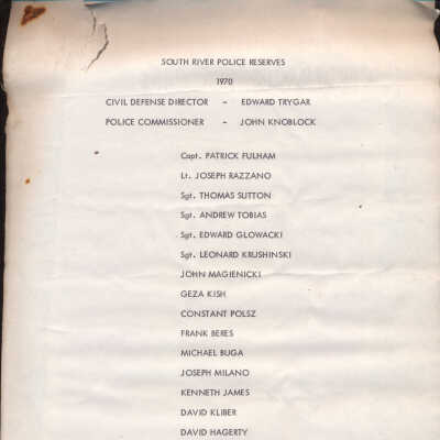 Rosters of the 1970 South River Police Department, 1970 South River Police Reserves, and 1970-1971 School Crossing Guards. The text is printed in black ink.