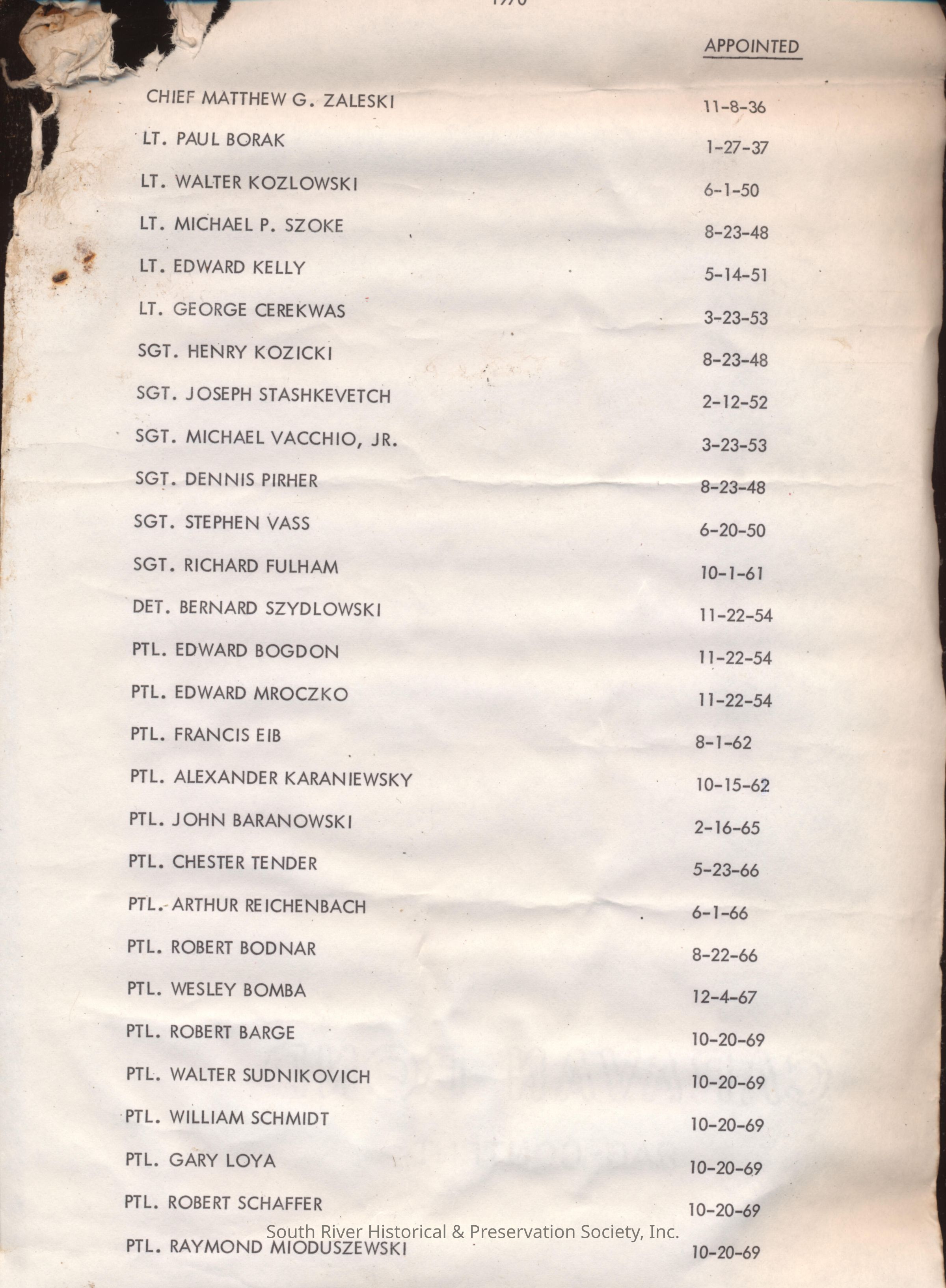 The Police Department roster includes date of appointment for each of the 28 officers listed. The names are listed in order by appointment date beginning with Chief Matthew G. Zaleski, appointed 11--8-36, and ending with Ptl. Raymond Mioduszewski, appointed 10-20-1969.