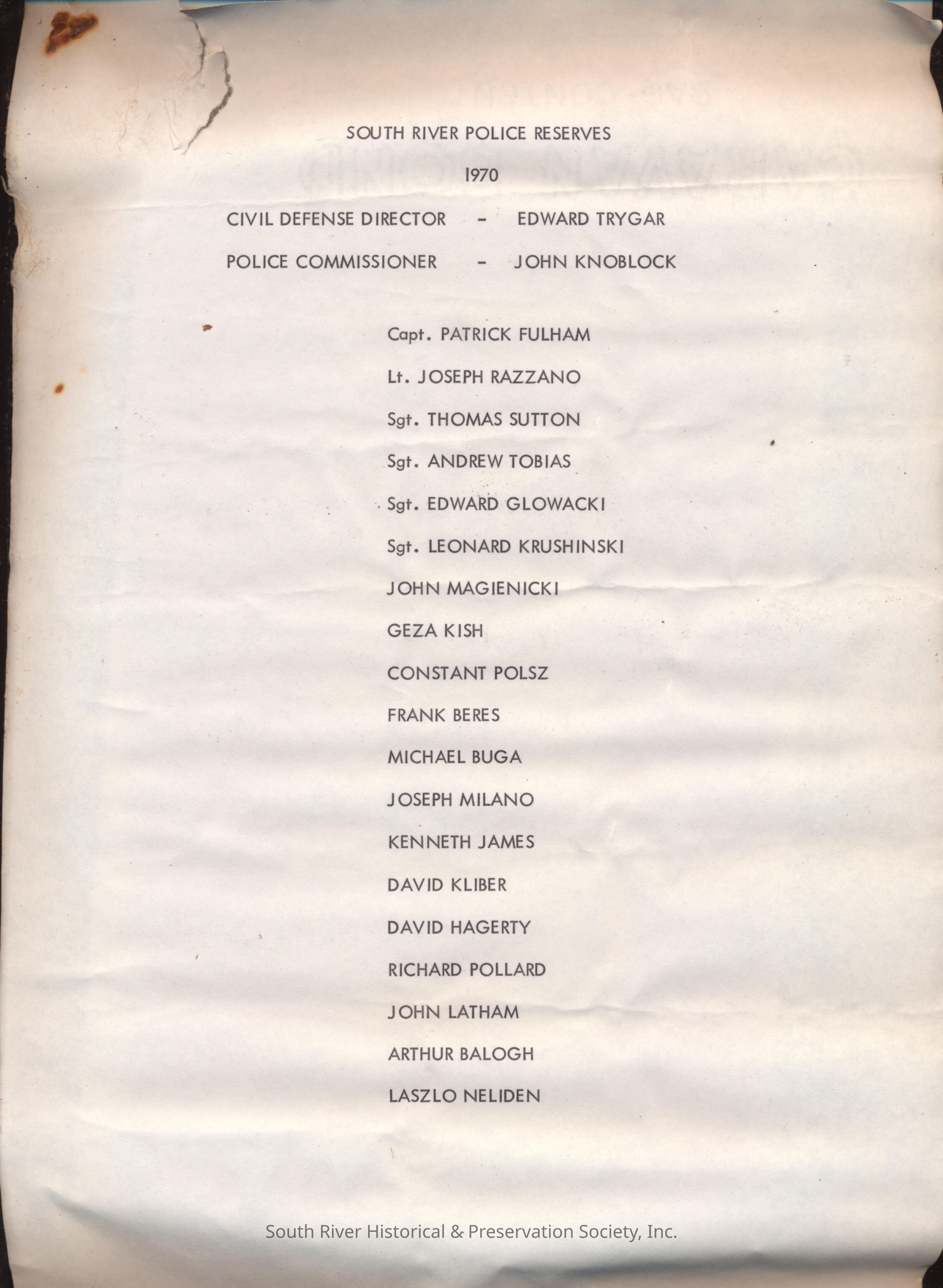 Consists of three sheets each measuring 8 1/2" x 12 7/8". Paper is in poor condition with creases, water damage, and marks from corroded staples. The police department roster is missing the upper left corner due to water damage.Acquisition