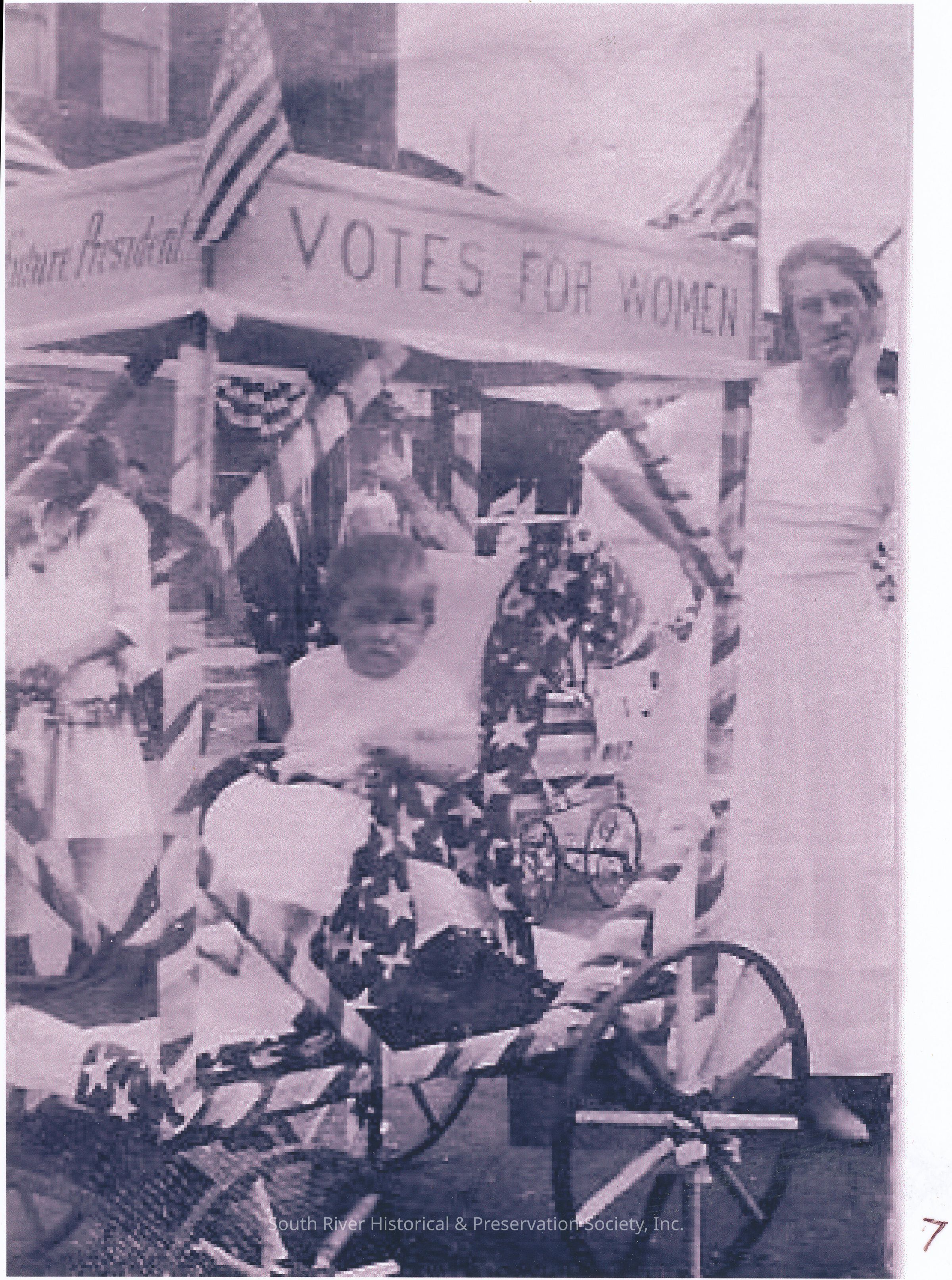 Photograph of June Sicknick in a buggy decorated for the baby parade during the celebration of South River's 200th anniversary on September 25, 1920. The slogan "Future President - Votes for Women" is visible along the front and side. Edna Keller Sicknick, mother of June, is standing behind the buggy.