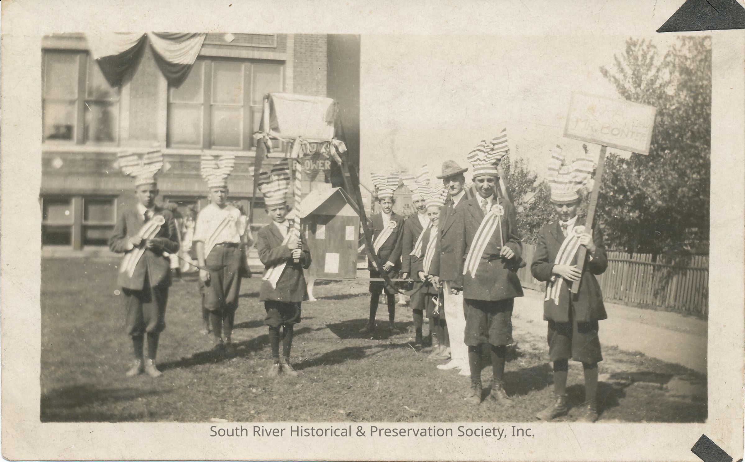 Photograph of eight unnamed students, wearing sashes and hats, with an unnamed adult, likely Professor E. Johnson Bonter. Students are carrying signs, a flag, and a model intended to represent South River's first school. The sign being held by the boy at the right reads "7-A, Mr. Bonter." Taken in front of School No. 3, later renamed Lincoln School, where Bonter taught seventh grade.