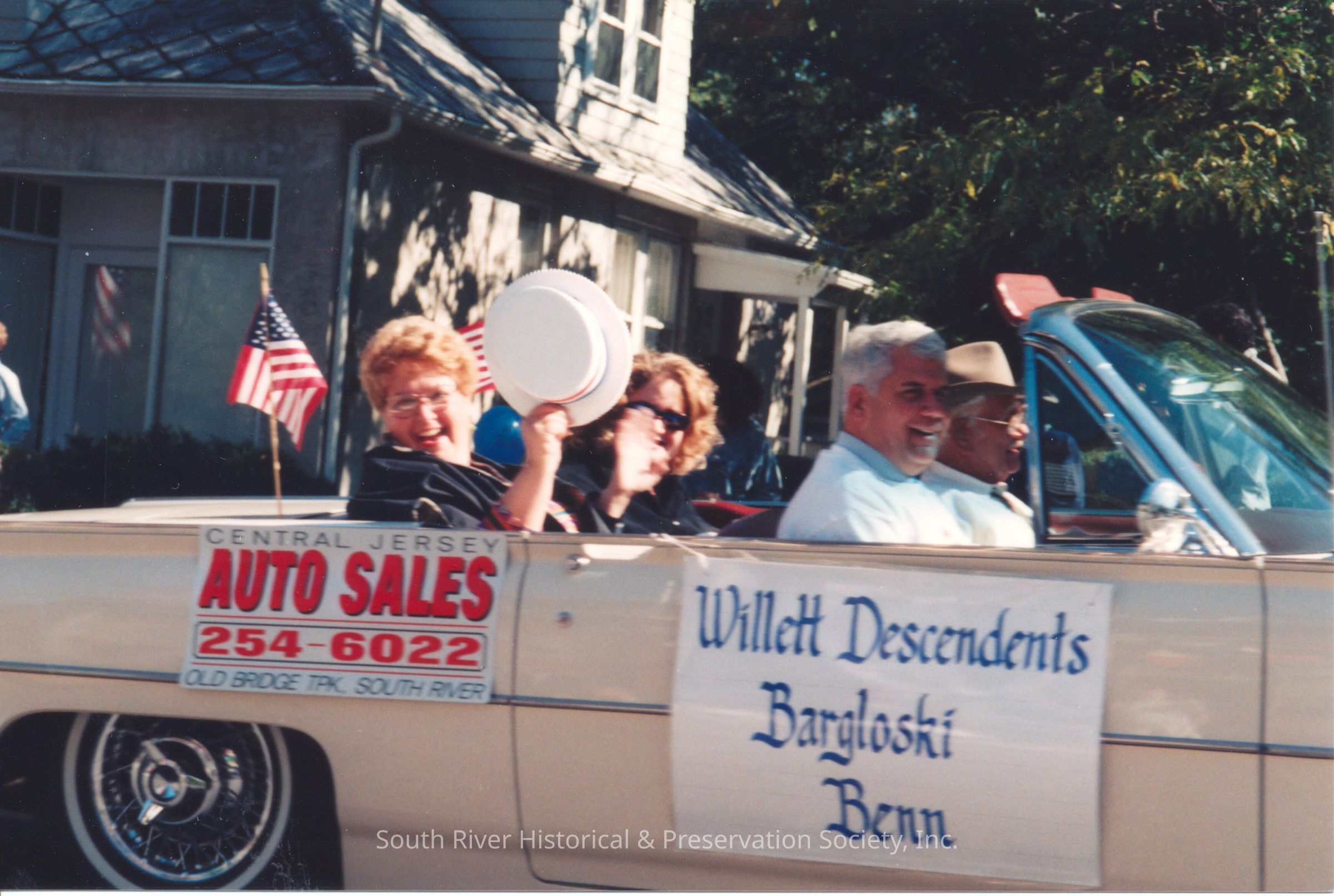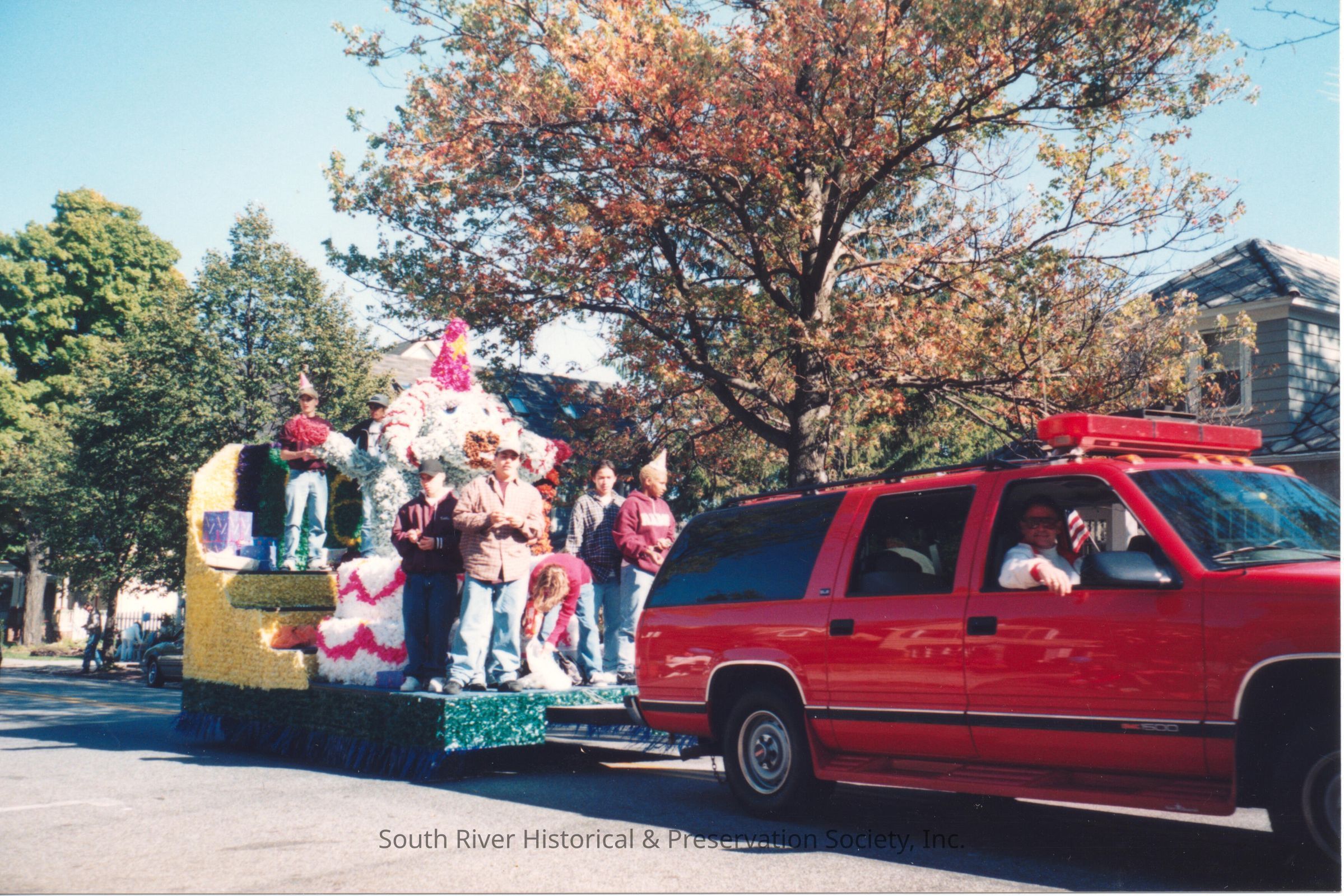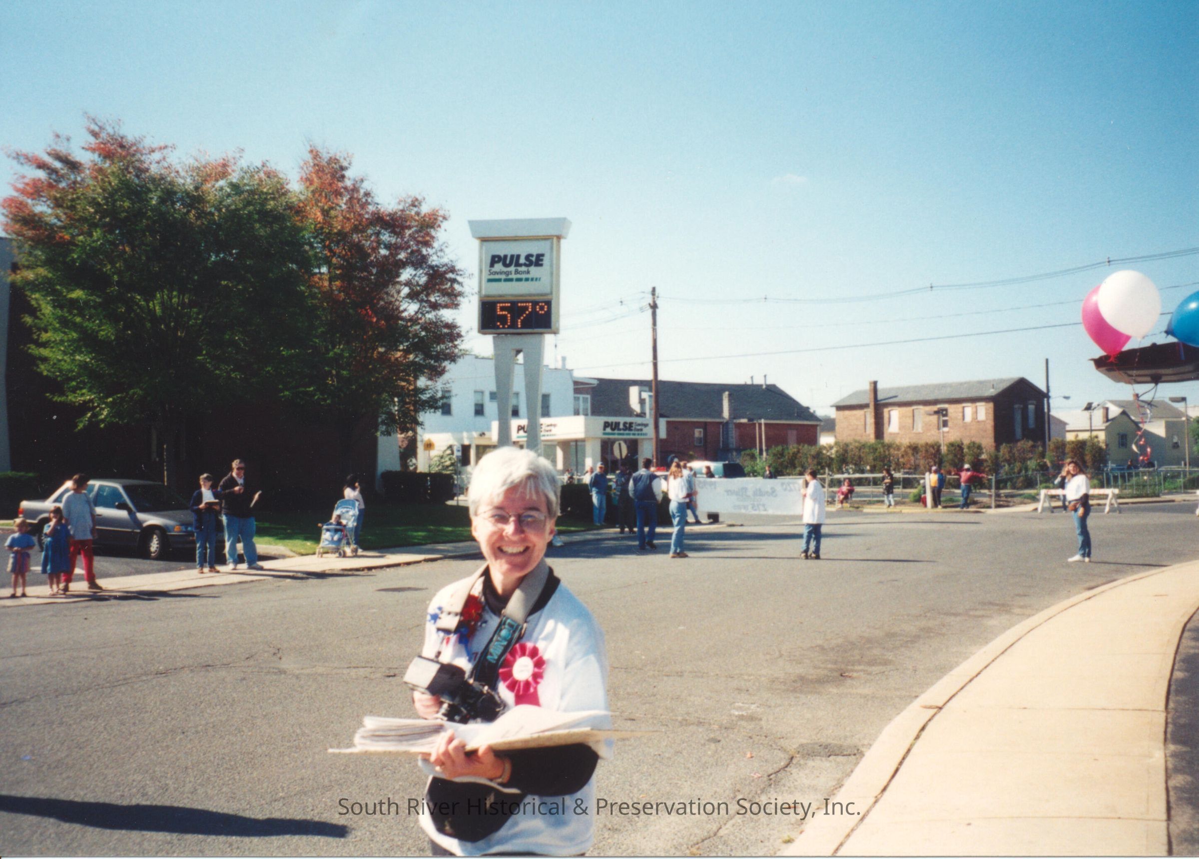 Jonathan and Jennifer Grimm carrying the banner at the start of the parade for South River's 275th anniversary.