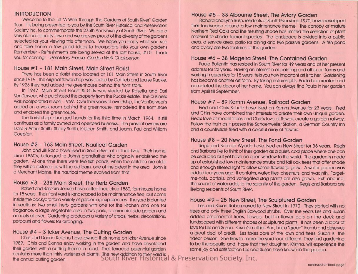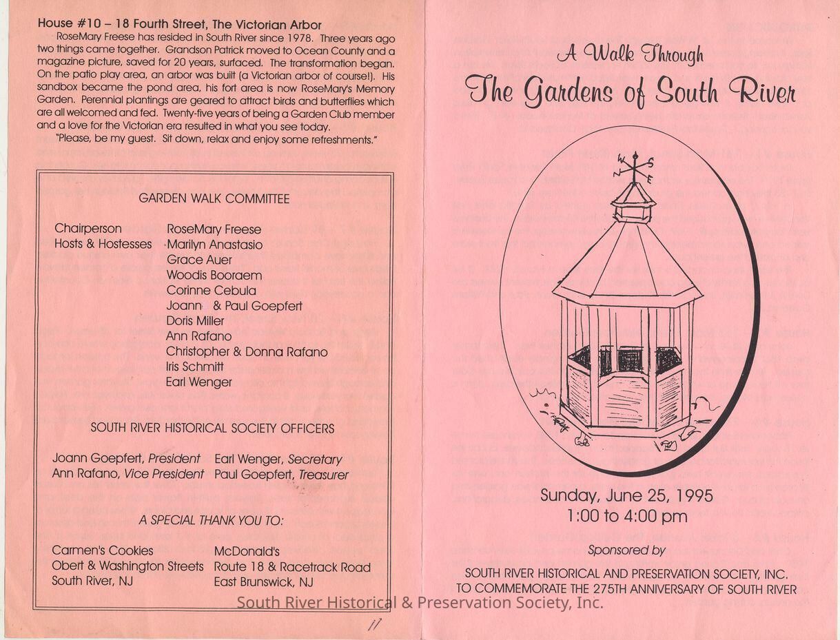 Pink paper program titled " A Walk Through The Gardens of South River, Sunday June 25, 1995 1:00 to 4:00 pm." The event was sponsored by the "South River Historical and Preservation Society, Inc. to commemorate the 275th Anniversary of South River"