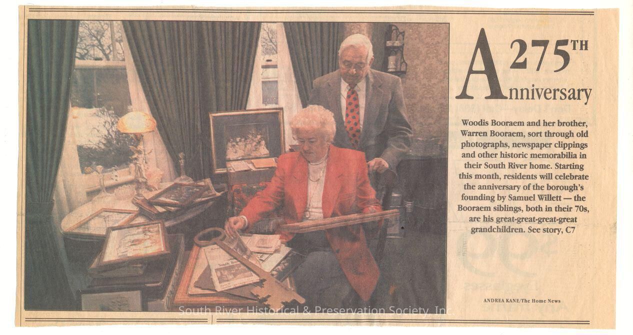 Summary reads, "Woodis Booraem and her brother, Warren Booraem, sort through old photographs, newspaper clippings, and other historic memorabilia in their South River home. Starting this month, residents will celebrate the anniversary of the boroughs founding by Samuel Willett -- the Booraem siblings, both in their 70s, are his great-great-great-great-grandchilden."