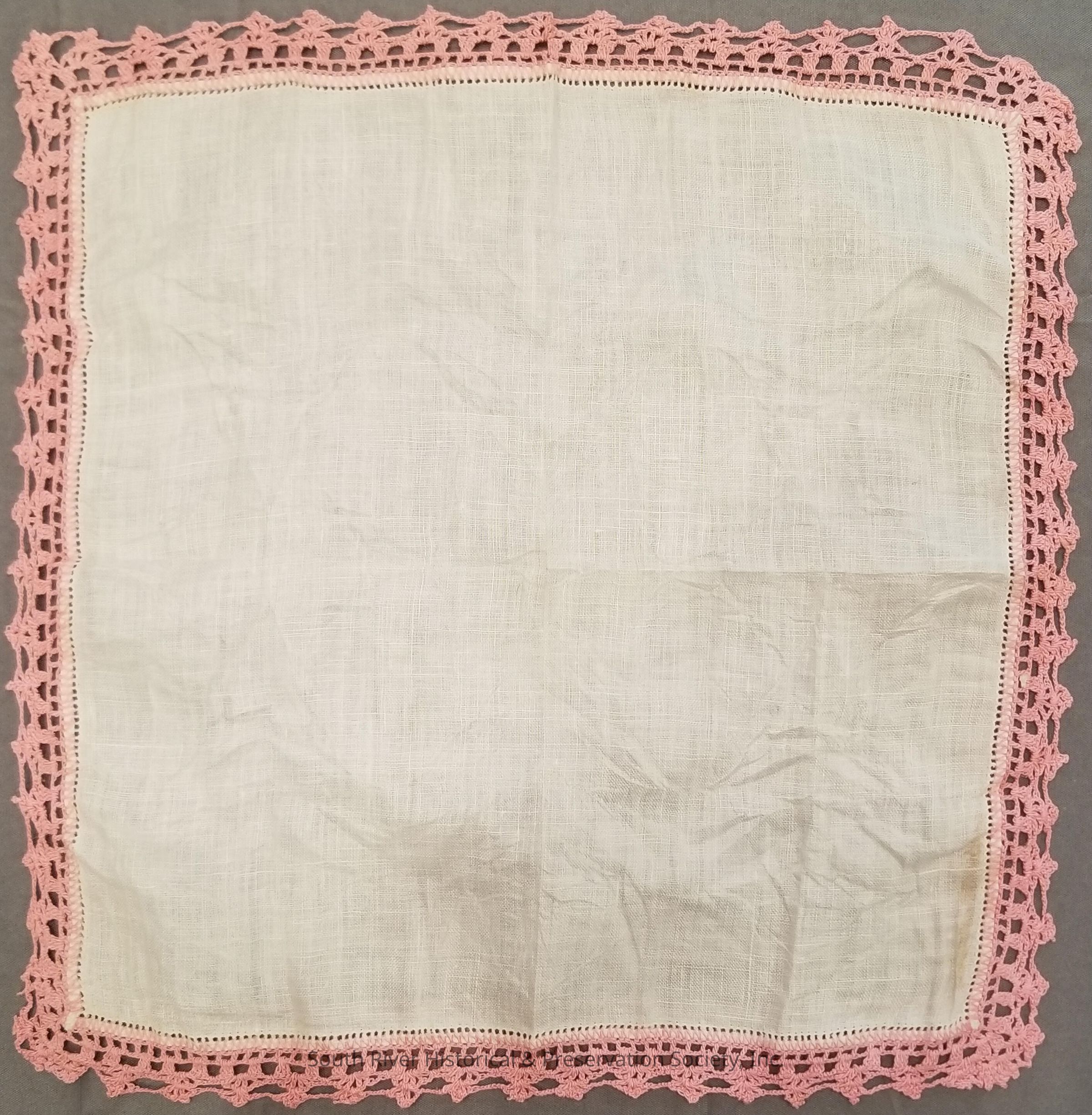 White linen handkerchief with pink crocheted edging. Measures approximately 11" square and is in good condition.