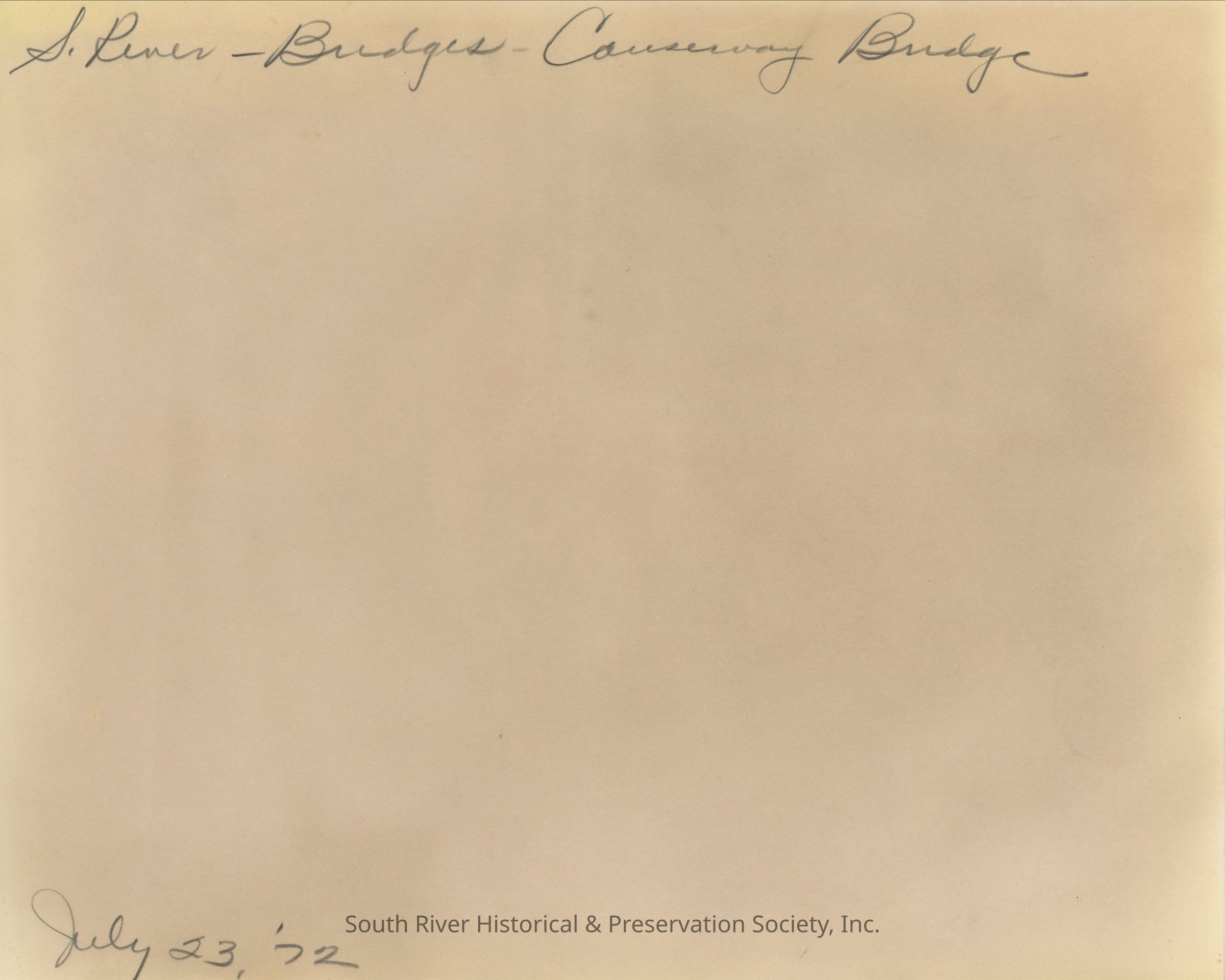 The back of the photograph has a handwritten note that reads, "S. River - Bridges - Causeway Bridge." A date is also handwritten, "July 23, '72."