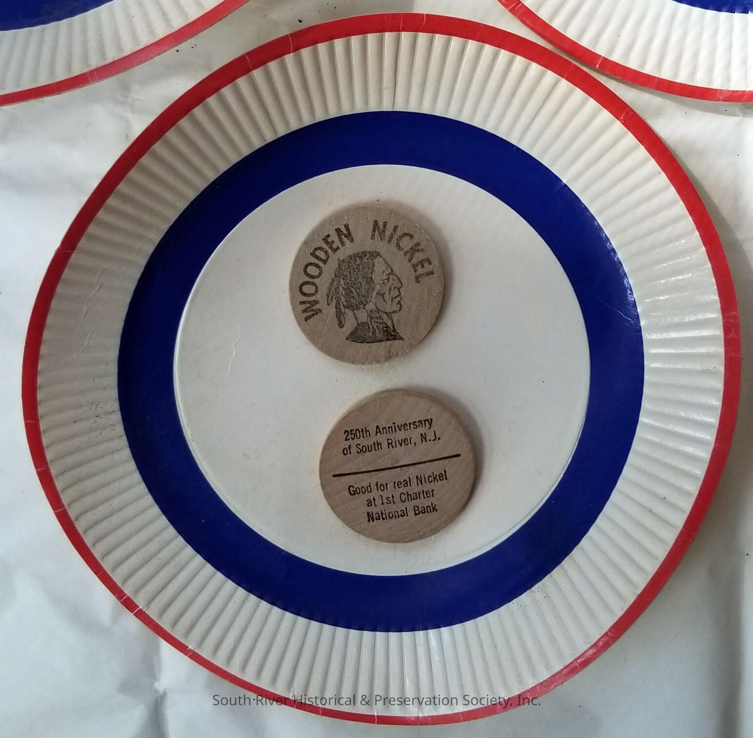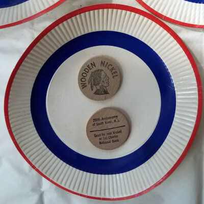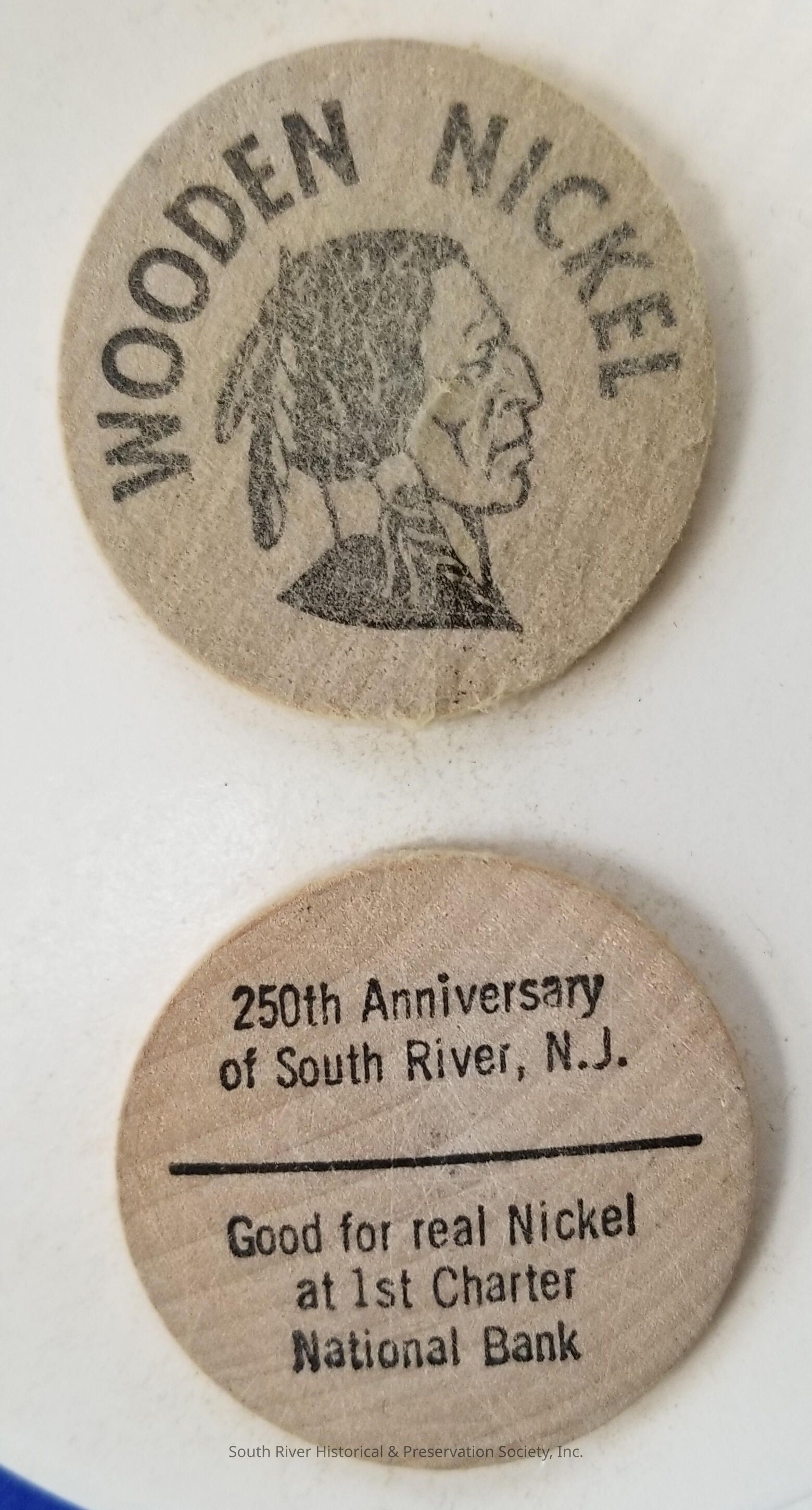 Tokens distributed in honor of the 250th anniversary of South River. N.J. in 1970. The face of each token is imprinted with an image of a Native American with the words "Wooden Nickel." The reverse side reads "250th Anniversary of South River, N.J. -- Good for real Nickel at 1st Charter National Bank."