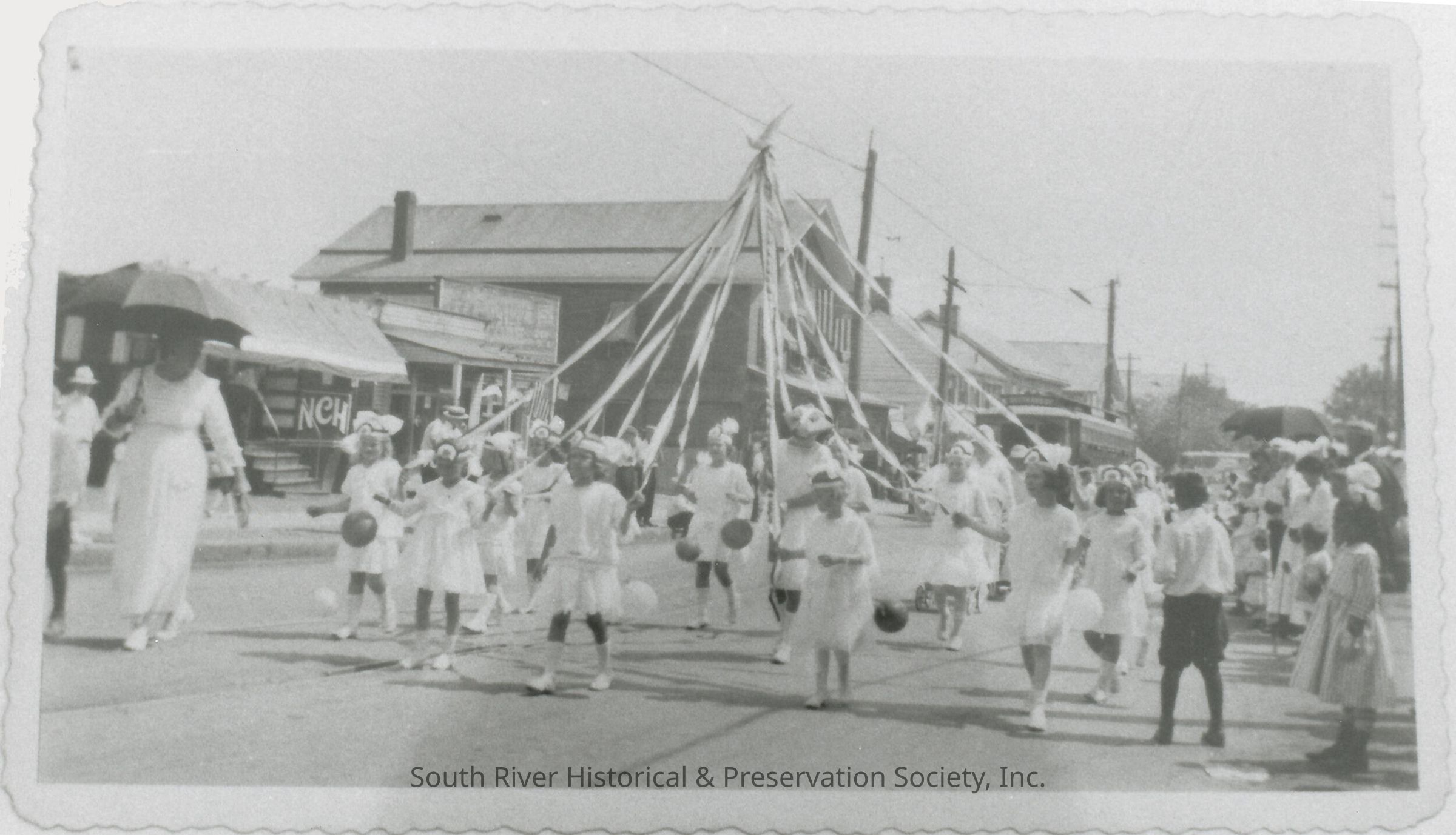 Photograph showing a group of young girls wearing white dresses and carrying a Maypole on Whitehead Avenue during the parade for the celebration of South River's 200th anniversary in 1920.