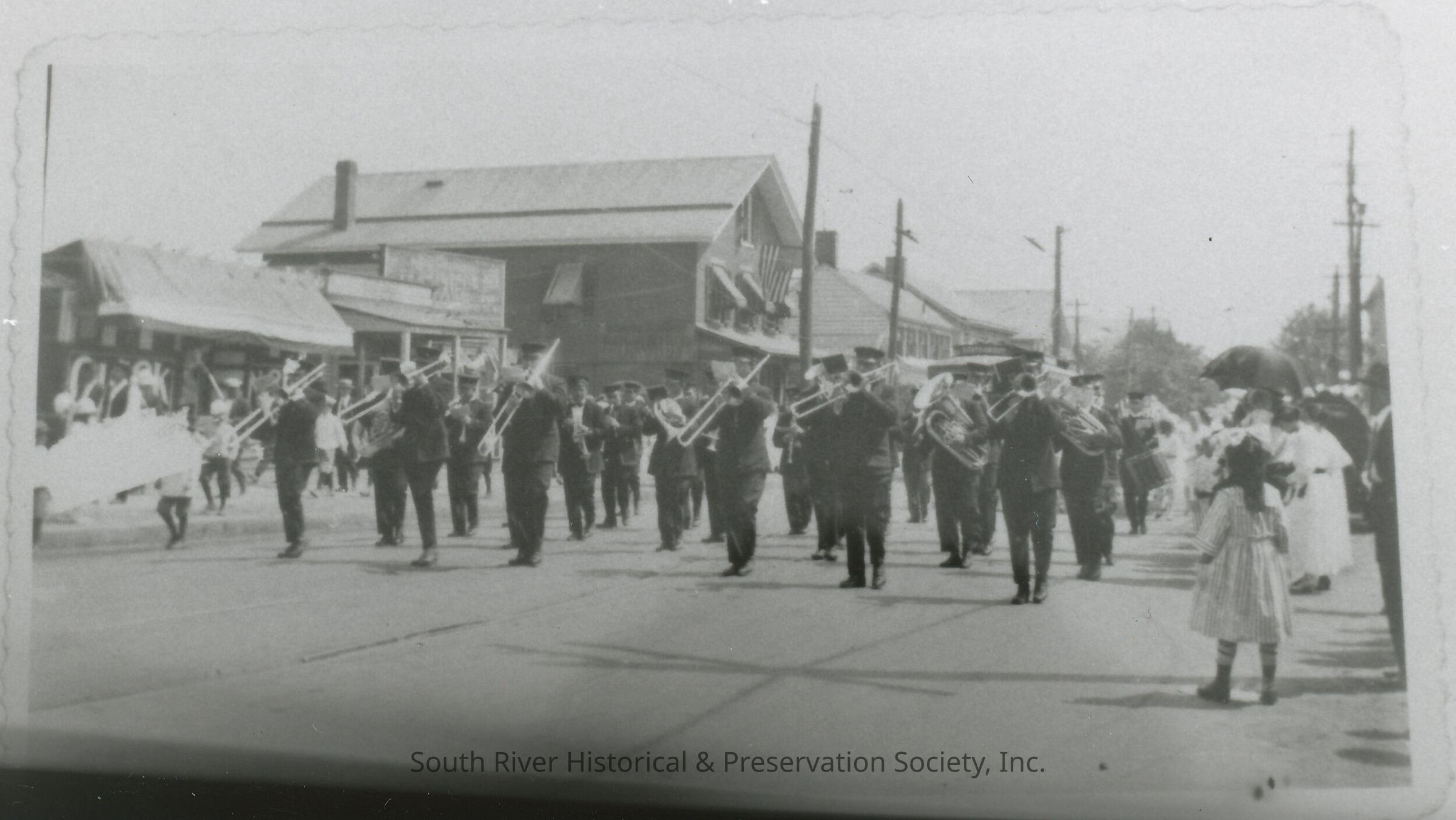 Black and white photograph showing a marching band on Whitehead Avenue during the parade for the celebration of South River's 200th anniversary in 1920. 3-1/2"x5-1/2" black and white photograph of a photograph. Poor quality.