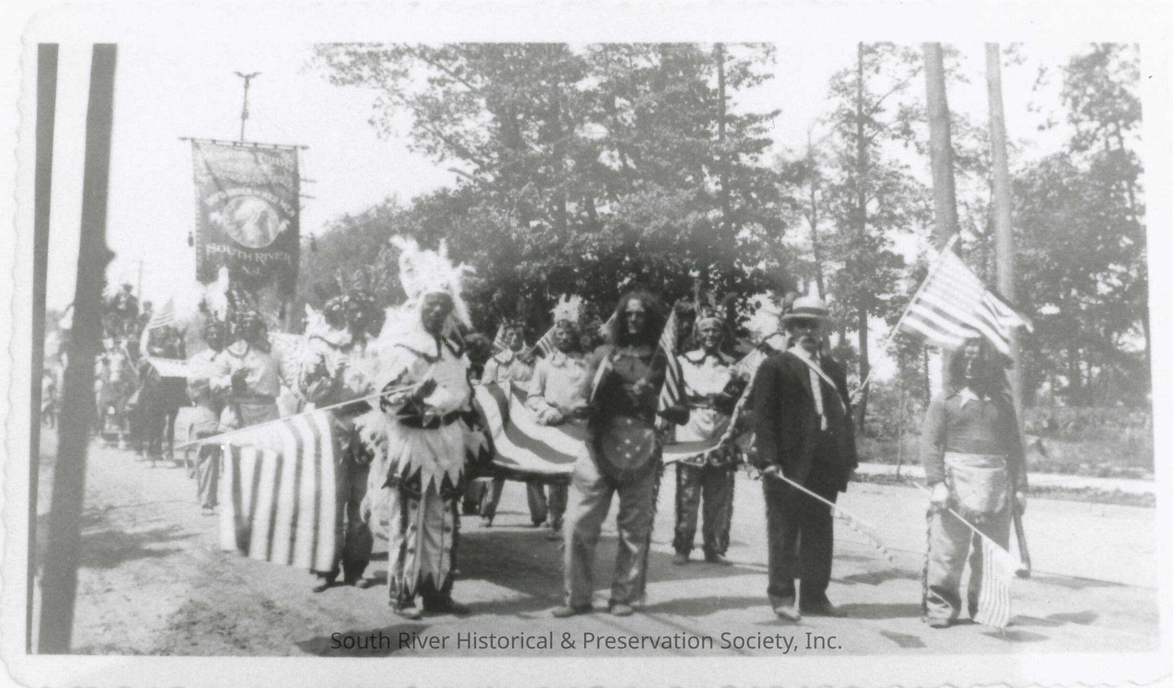 Black and white photograph of a local organization, the Passyunk Tribe, Improved Order of Red Men during the parade for the celebration of South River's 200th anniversary in 1920.