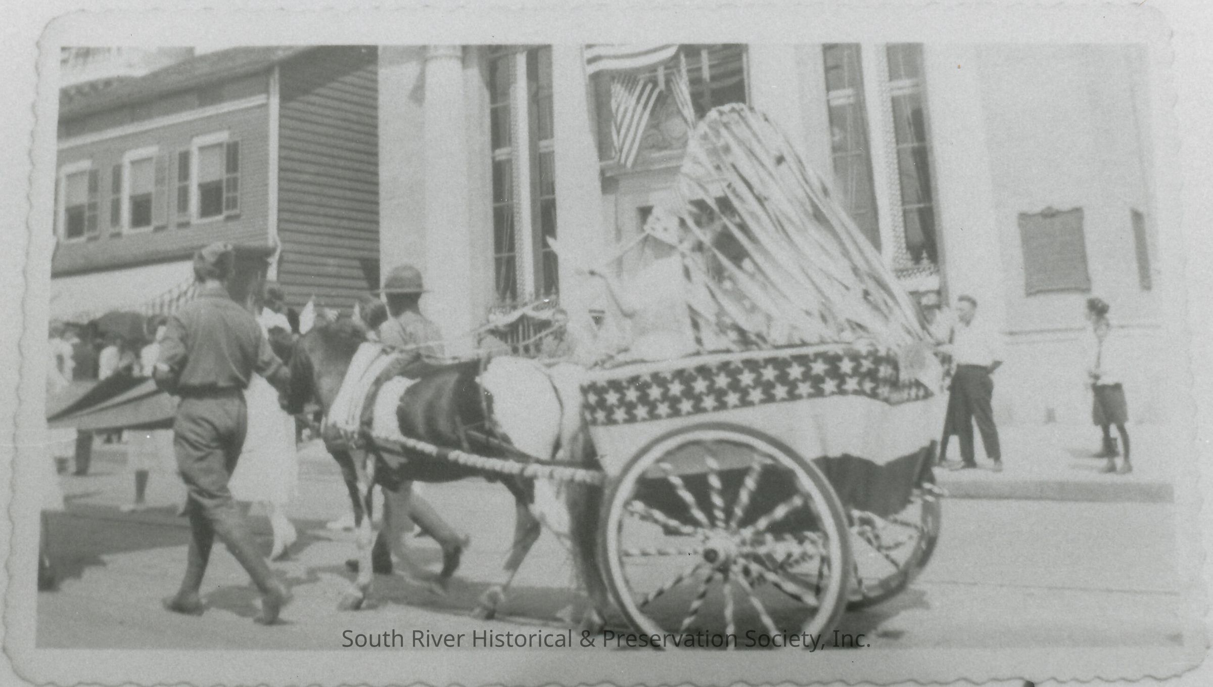 Black and white photograph showing a horse pulling a decorated cart during one of the events held for the celebration of South River's 200th anniversary in 1920. The cart is decorated with Stars and Stripes and accompanied by two soldiers in World War I uniforms. What was then the First National Bank, located at the corner of Main Street and Stephen Street, is in the background.