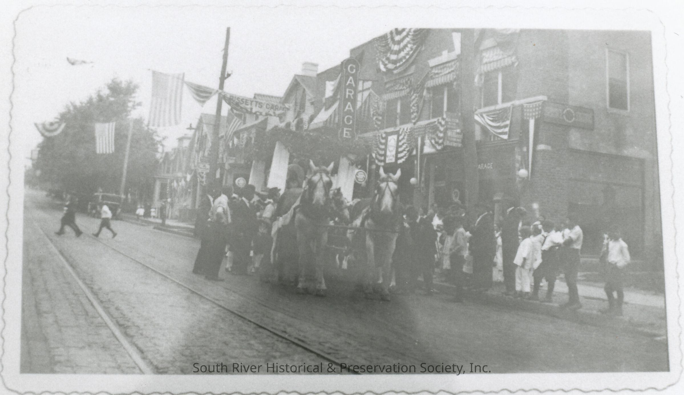 Black and white photograph showing a frontal view of the horse-drawn Queen Riverie float in front of Bissett's Garage on Main Street near Gordon Street during the parade for the celebration of South River's 200th anniversary in 1920. Spectators are gathered around the float.