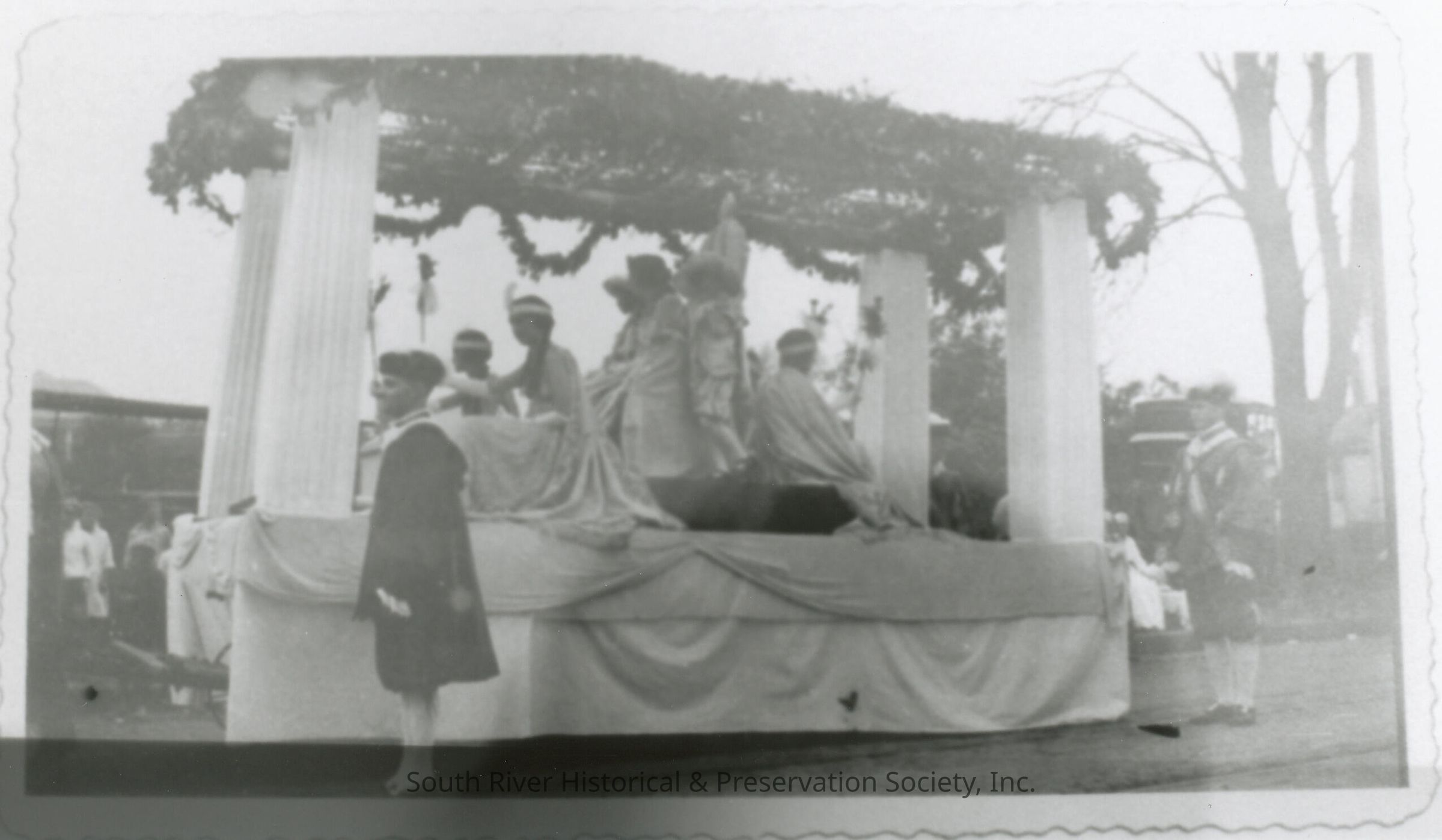 Black and white photograph showing the Queen Riverie float with attendants. Eva Bissett is the queen in the throne at the center of the float from the parade for the celebration of South River's 200th anniversary in 1920.