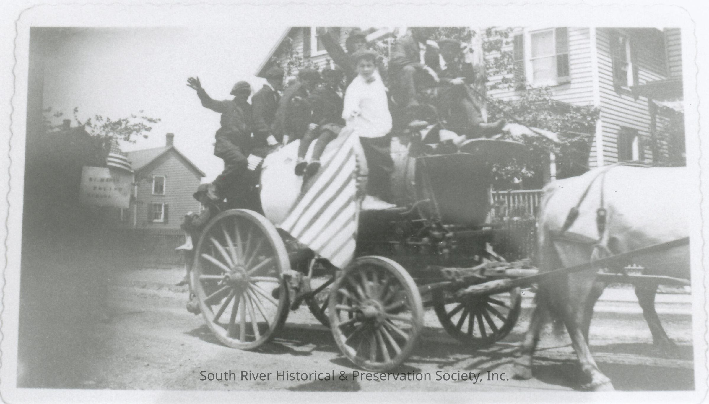 Photograph showing boys atop a large barrel pulled by a horse during the parade for the 200th anniversary in 1920. 3-1/2"x5-1/2" black and white photograph of a photograph. Poor quality.