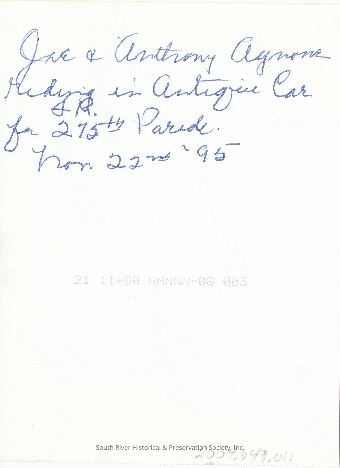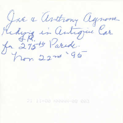 A handwritten note on the back reads, "Joe and Anthony Agnone riding in Antique Car for S.R. 275th Parade. Nov. 22nd, '95"