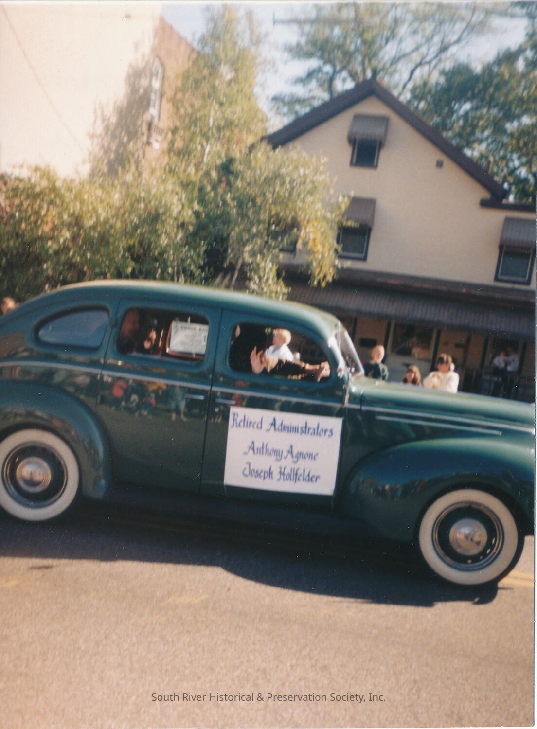 Color photograph of a green car with a hand lettered sign that reads, " Retired Administrators, Anthony Agnone, Joseph Hollfelder"