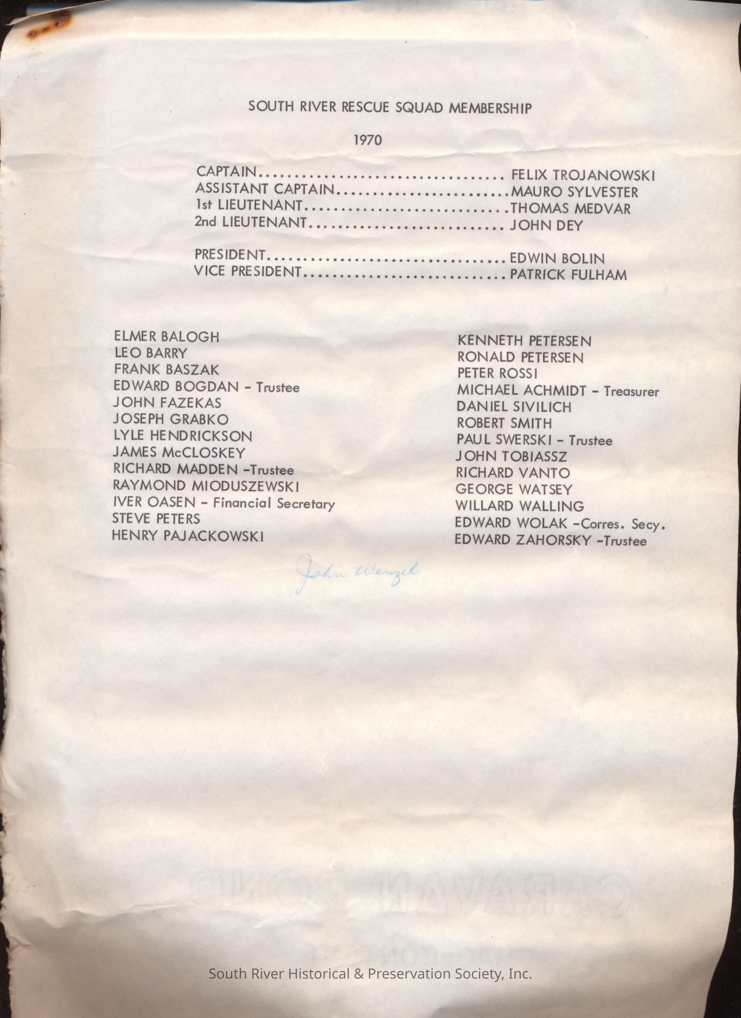 Roster of the 1970 South River Rescue Squad. The text is printed in black ink.