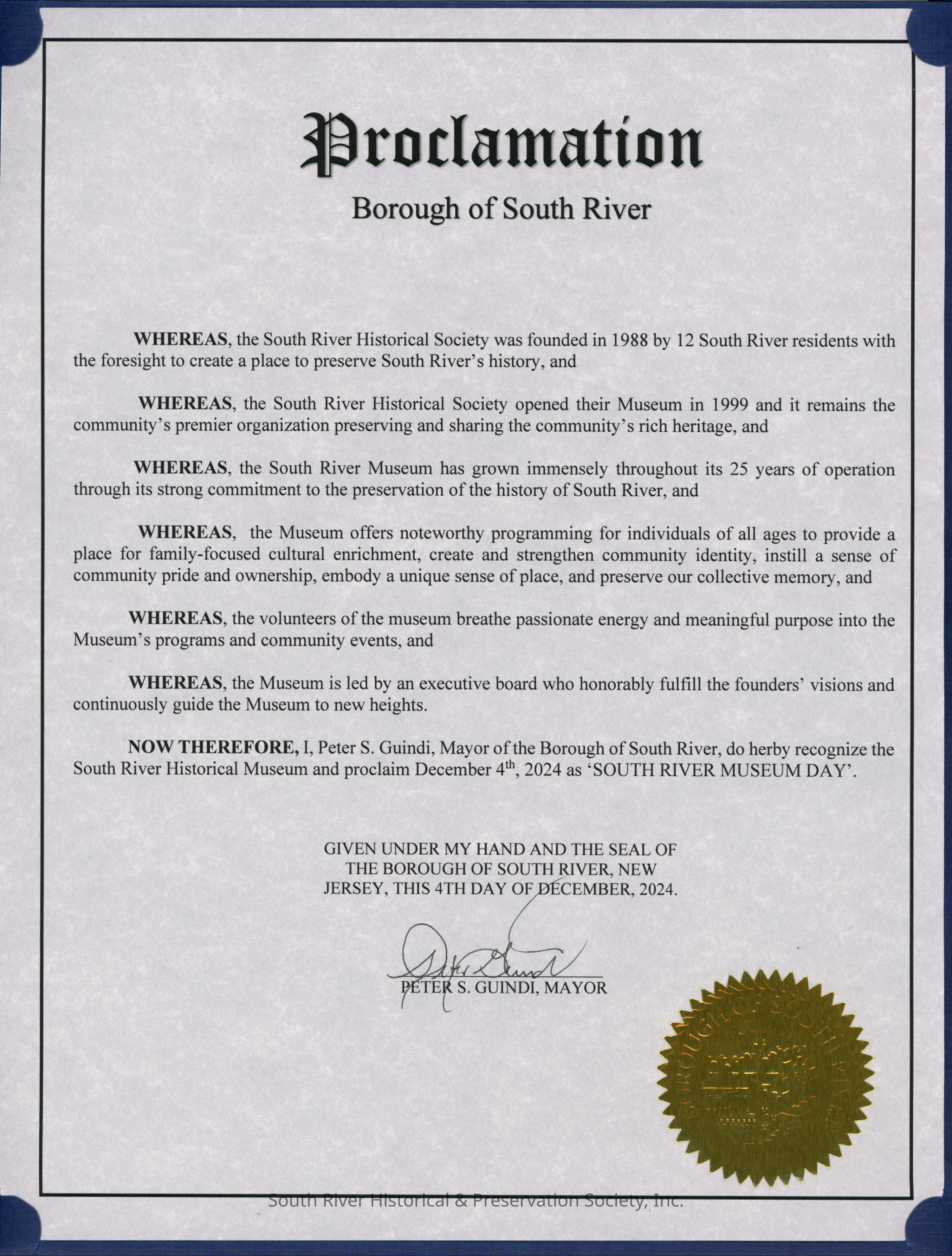 Proclamation from the Borough of South River declaring December 4, 2024, South River Museum Day in honor of the 25th anniversary of the opening of the South River Museum. Signed by Mayor Peter S. Guindi. Lower left corner has a gold Borough of South River seal.