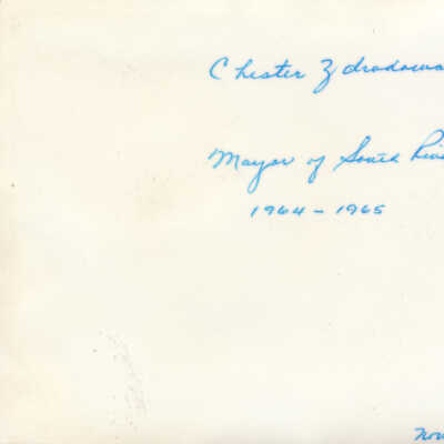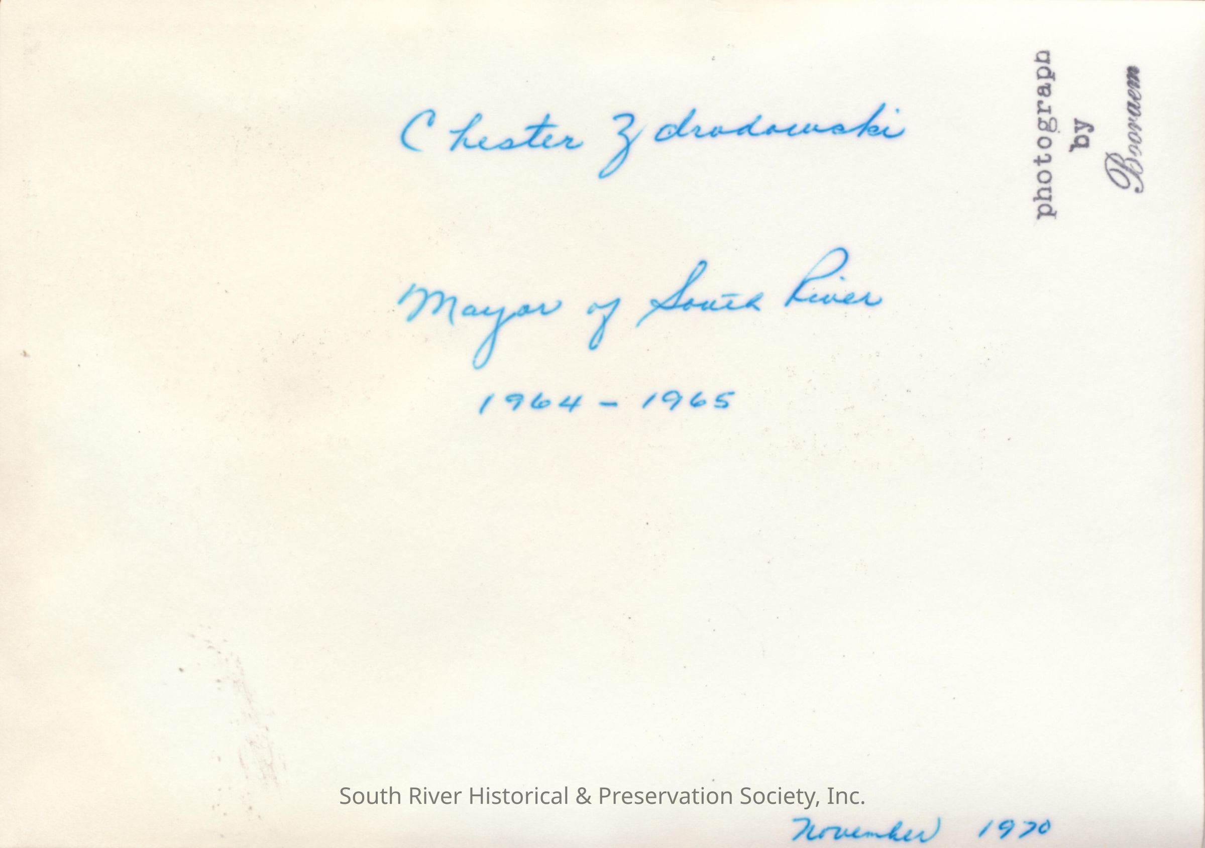 A note handwritten on the back in blue ink reads "Chester Zdrodowski , Mayor of South River, 1964-1965; November 1970."