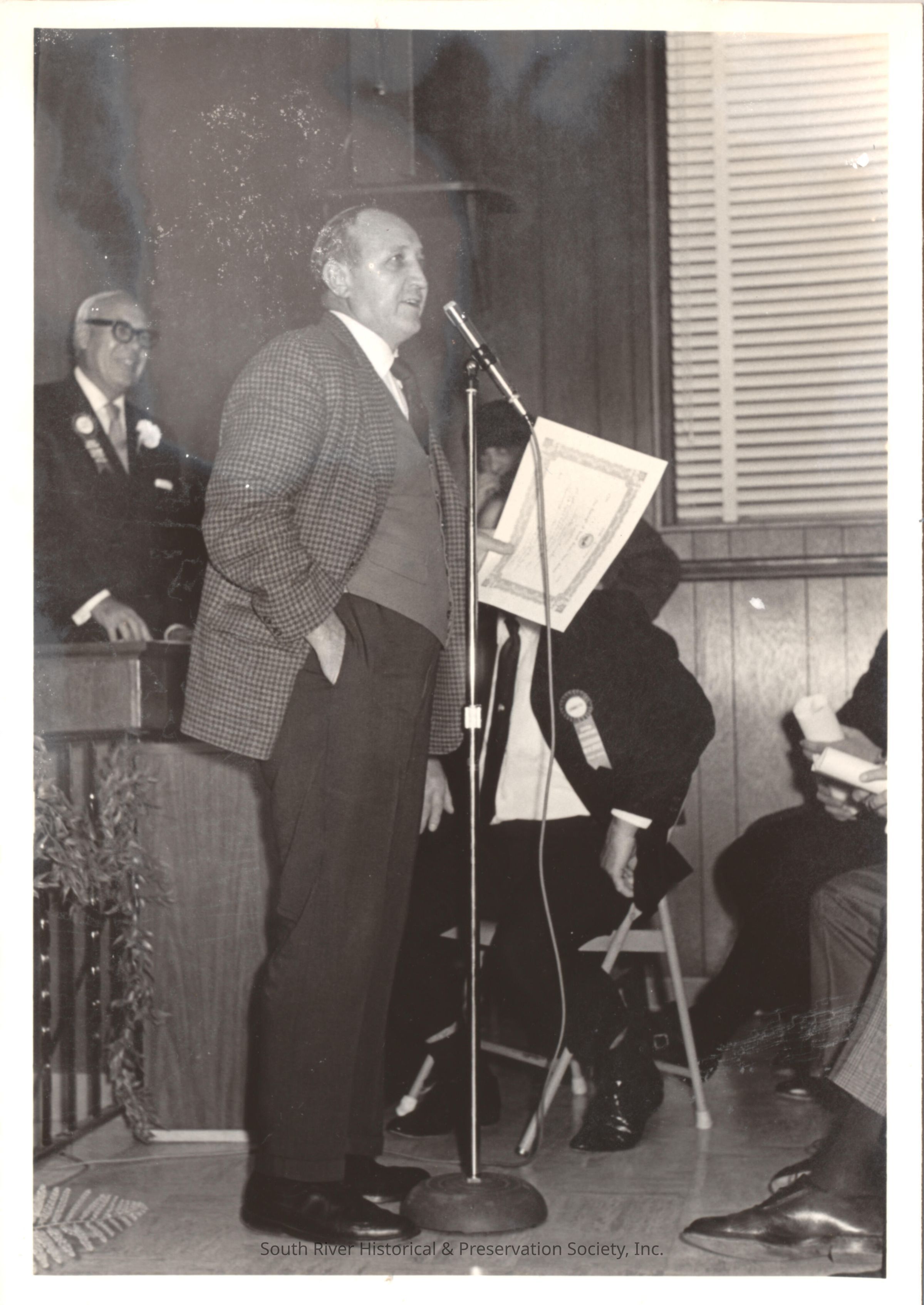 Photograph of former mayor Chester Zdrodowski accepting the certificate presented to him in commemoration of South River's 250th anniversary. The presentation was part of the opening ceremony held in the Council chambers in the Borough Hall on November 6, 1970. Joseph Mark is visible at the left.