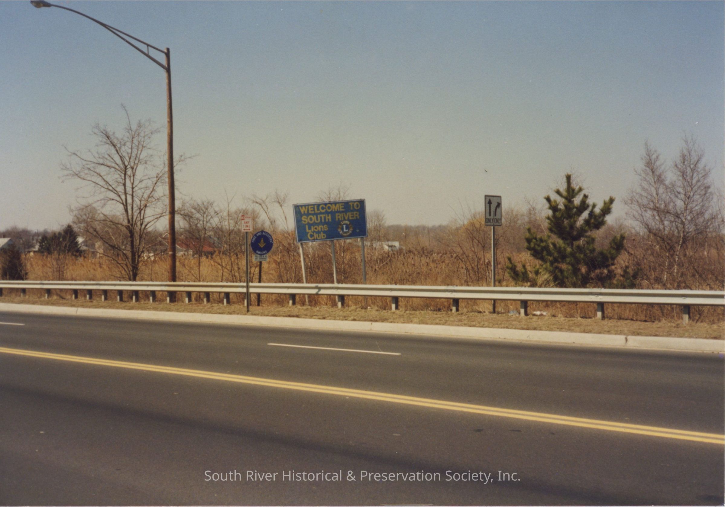 Color photograph of a sign located on the bridge between South River and Sayreville that reads, "Welcome to South River, Lions Club." No date.