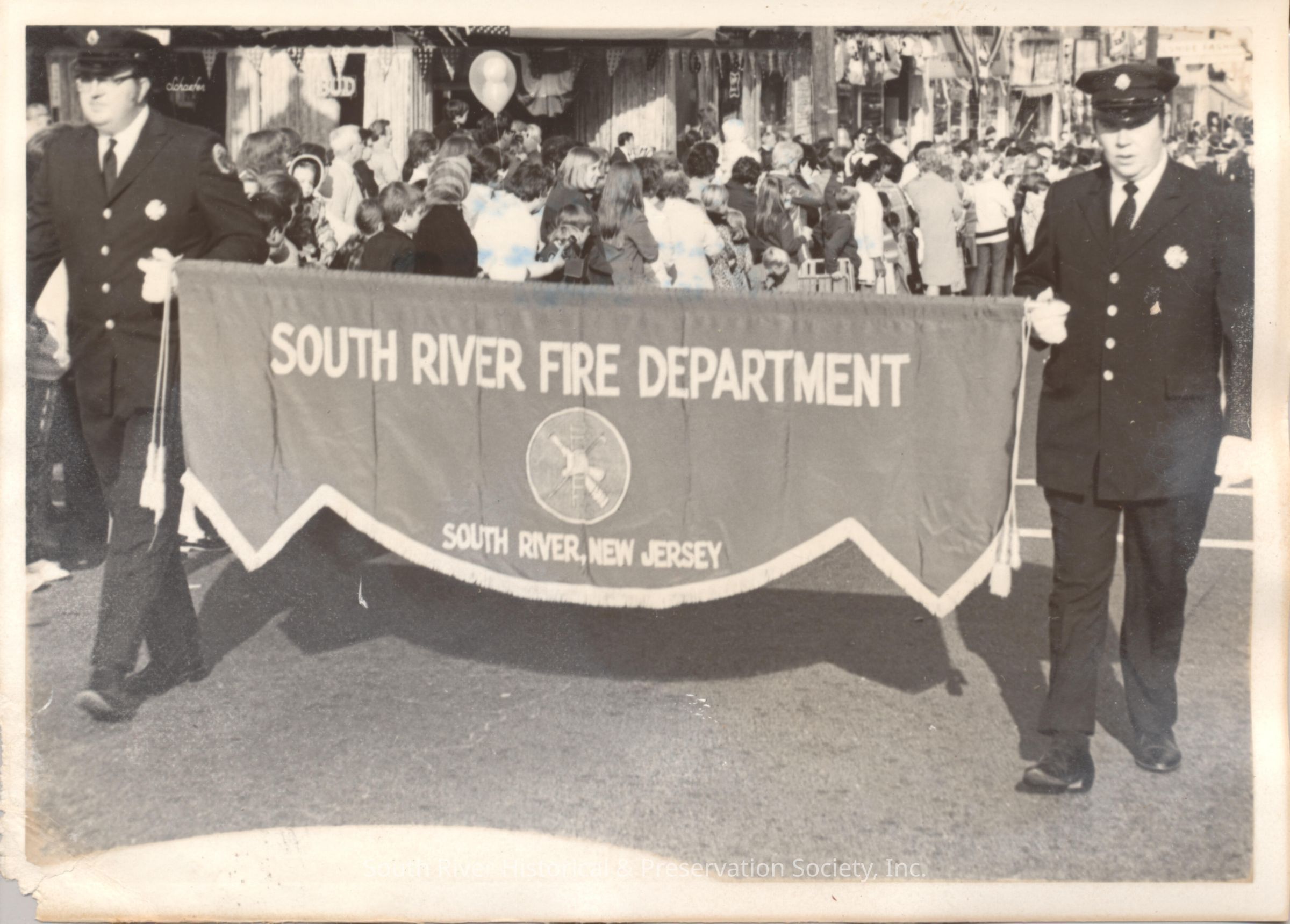 Photograph of two firefighters carrying the banner for the South River Fire Department in the parade held for the celebration of South River's 250th anniversary in 1970. The fireman on the left is Frank Mako; the one on the right is unidentified.