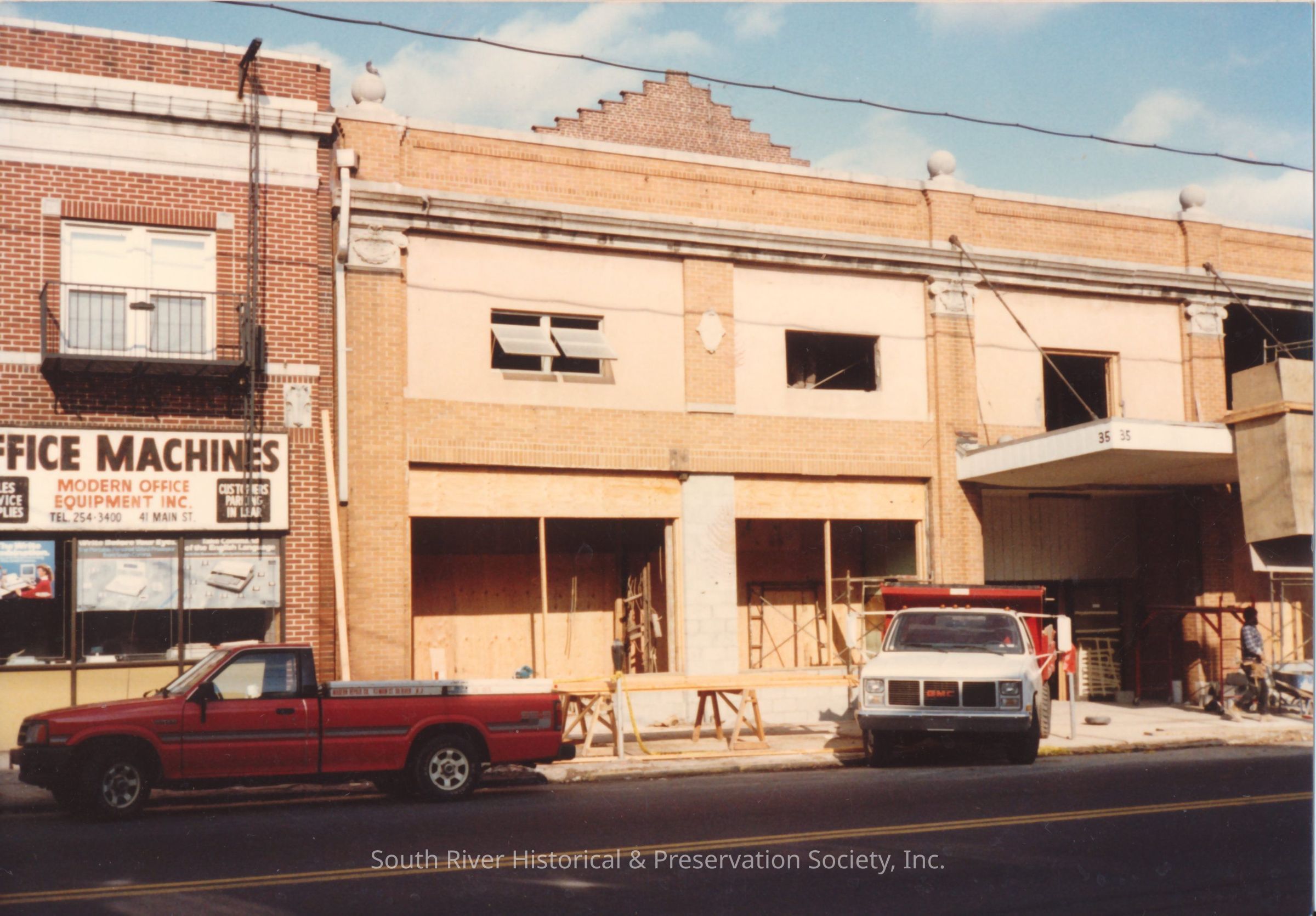 Color photograph of the former Capitol Theatre building at 35 - 39 Main Street undergoing renovations for use as a factory and warehouse for the assembly and distribution of electronics and retail stores. View is of the front left end of the building with a truck visible on the sidewalk near the center of the building. A portion of the building to the left featuring an office machines store is also visible.