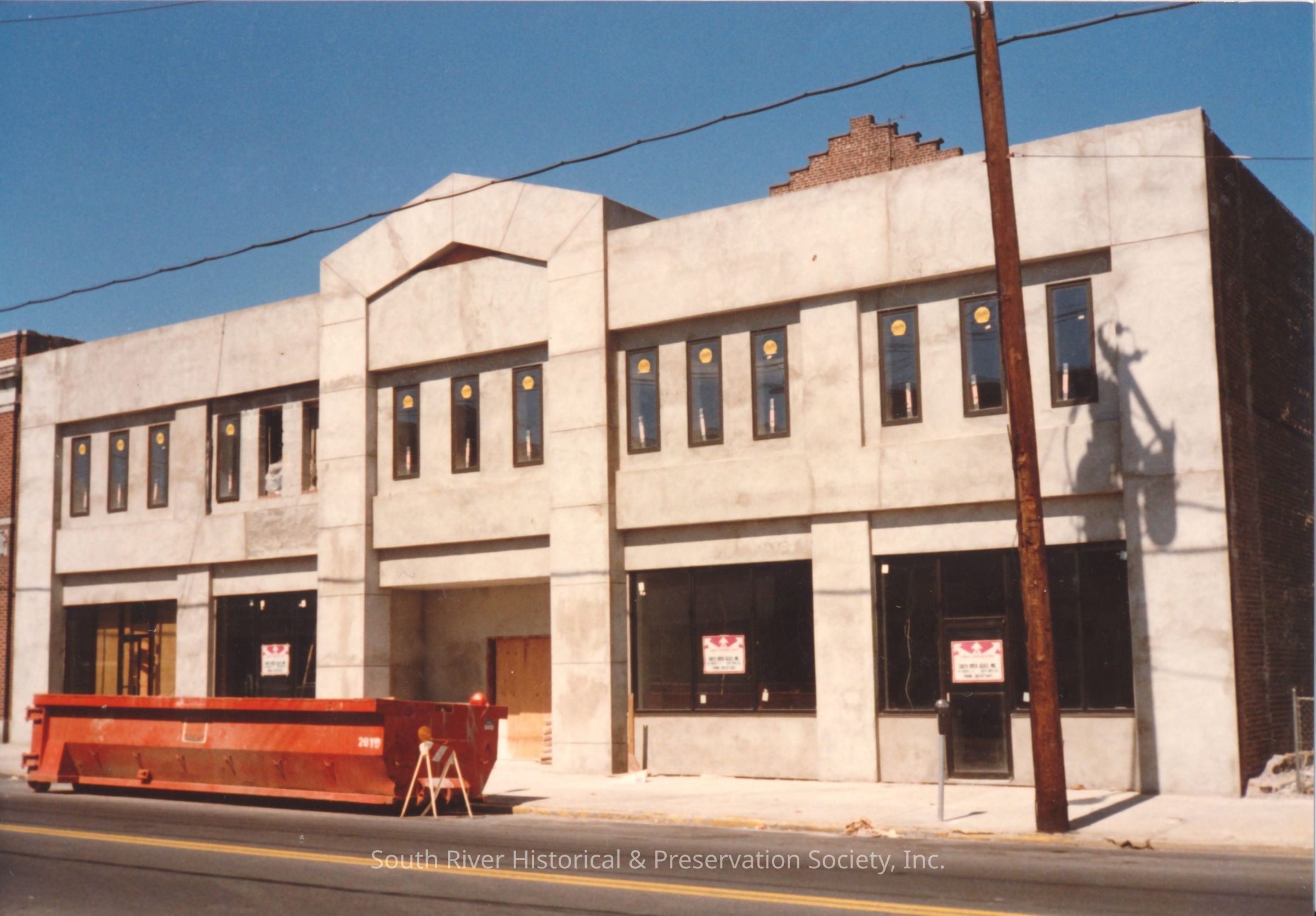 Color photograph of the former Capitol Theatre building at 35 - 39 Main Street undergoing renovations for use as a factory and warehouse for the assembly and distribution of electronics and retail stores. The view is of the front of the building. Ground floor shop windows have been added and the finish coat is complete covering the original facade and medallion ornaments. A dumpster sits on the street in front the building.