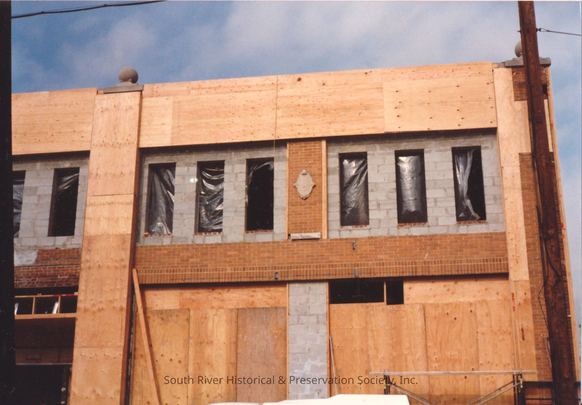 Color photograph of the former Capitol Theatre building at 35 - 39 Main Street undergoing renovations for use as a factory and warehouse for the assembly and distribution of electronics and retail stores. View is of the upper section of front right end of the building. A portion of the original building facade is visible with a medallion ornament between the windows. Much of what's visible is covered in plywood, but new window openings are evident in the upper floor. Each window opening is covered with plastic sheeting, some torn.