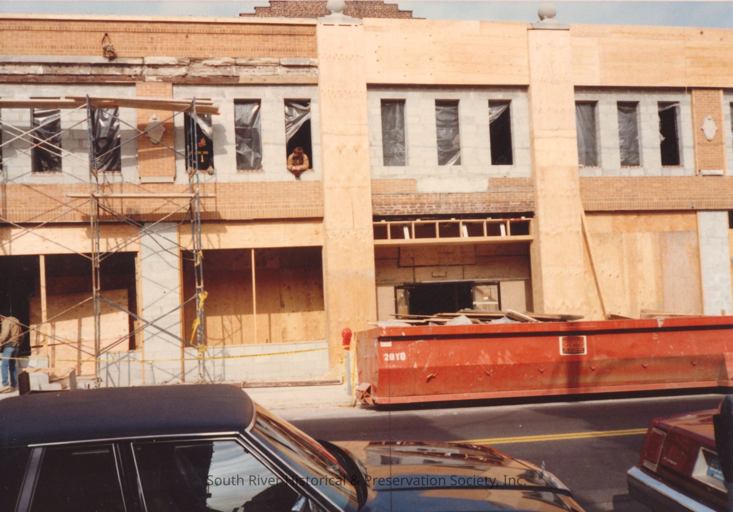 Color photograph of the former Capitol Theatre building at 35 - 39 Main Street undergoing renovations for use as a factory and warehouse for the assembly and distribution of electronics and retail stores. View is of the center section of the building. Portions of the original building facade are visible with medallion ornaments between the windows. Much of what's visible is covered in plywood, but new window openings are evident in the upper floor. Each window opening is covered with plastic sheeting, some torn, and a man is leaning out one of the windows. The left side of the building has scaffolding in front of it.