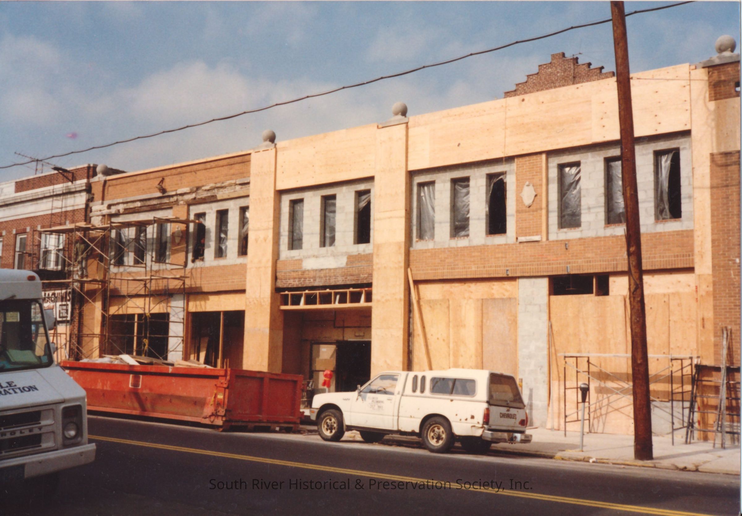 Color photograph of the former Capitol Theatre building at 35 - 39 Main Street undergoing renovations for use as a factory and warehouse for the assembly and distribution of electronics and retail stores. View is of the front of the building. Portions of the original building facade are visible with medallion ornaments between the windows. Much of what's visible is covered in plywood, but new window openings are evident in the upper floor. Each window opening is covered with plastic sheeting, some torn. The left side of the building has scaffolding in front of it. A portion of the building to the left is visible.