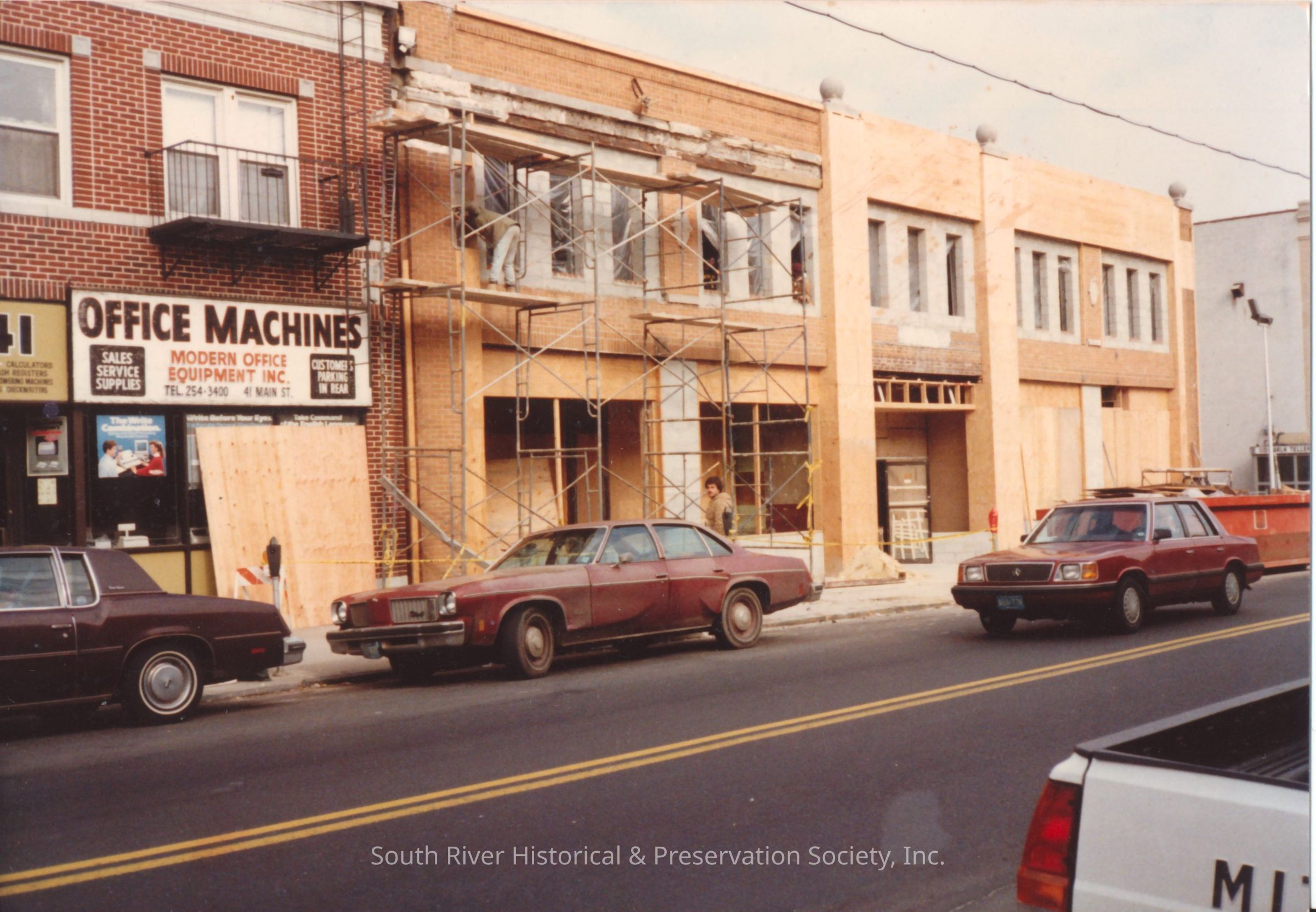 Color photograph of the former Capitol Theatre building at 35 - 39 Main Street undergoing renovations for use as a factory and warehouse for the assembly and distribution of electronics and retail stores. View is of the front of the building. Portions of the original building facade are visible with medallion ornaments between the windows. Much of what's visible is covered in plywood, but new window openings are evident in the upper floor. Each window opening is covered with plastic sheeting, some torn. A man is on the scaffolding in front of the left side of the building. The "Office Machines" business in the building to the left is visible.